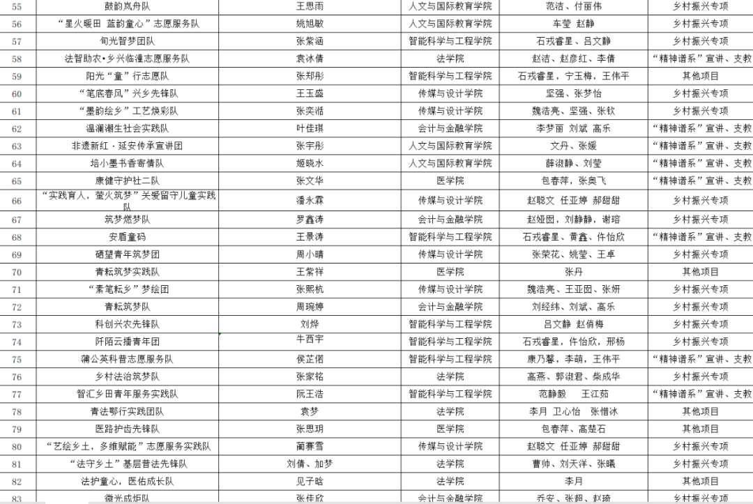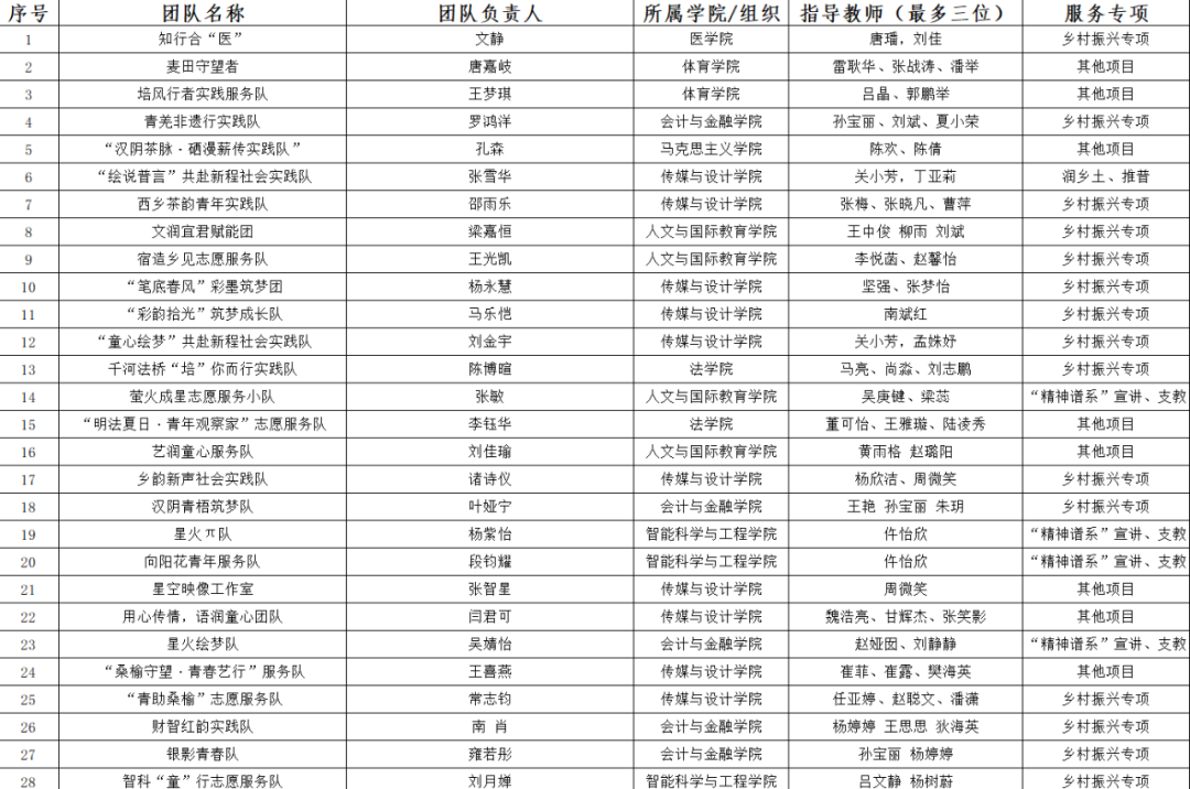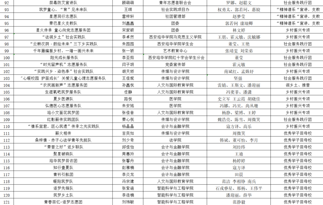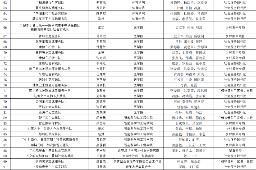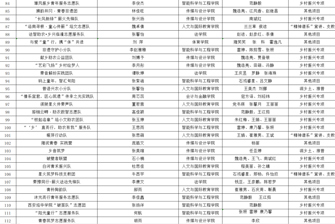 为进一步发挥共青团在高校思想政治工作中的主力军作用,引领培华青年扎根中国大地,在实践的“大思政课”中“受教育、长才干、做贡献”,2025年西安培华学院暑期“三下乡”社会实践活动共组建团队305支,经答辩审核立项、综合评审,最终确定140支重点立项团队,130支一般立项团队,现予以公示。