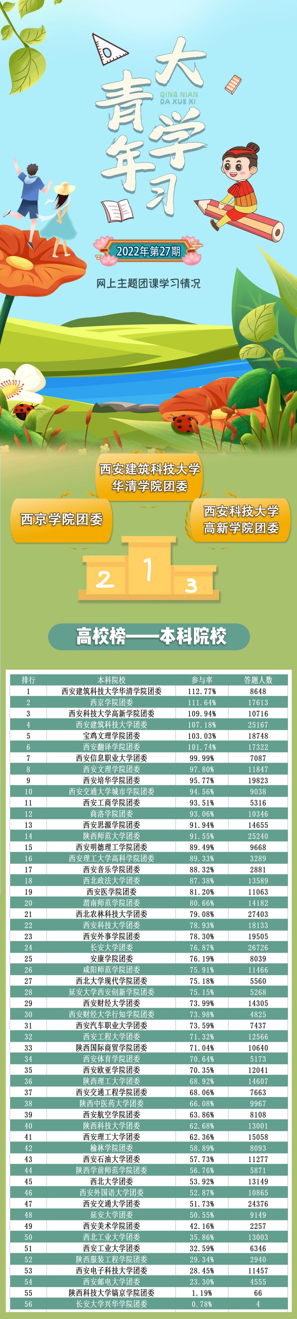 在上期的“青年大学习”中,西安培华学院团委排名第9名;参与率95.77%,答题人数19823次,各学院还需继续努力。希望各二级学院团委能更加积极广泛地动员好团员青年参与到“大学习”中,让团员青年更好地学习党的理论与主张。