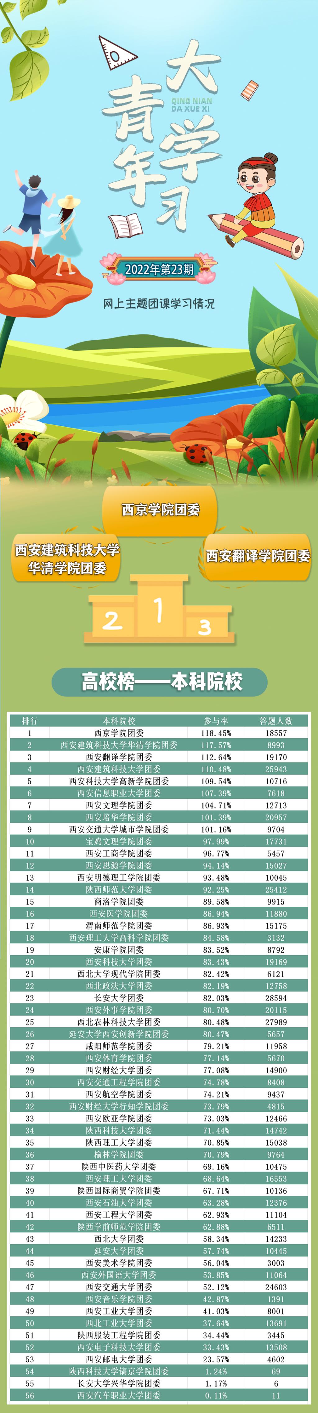 在上期的“青年大学习”中,西安培华学院团委排名第8名;参与率101.39%,答题人数20957次,各学院还需继续努力。希望各二级学院团委能更加积极广泛地动员好团员青年参与到“大学习”中,让团员青年更好地学习党的理论与主张。