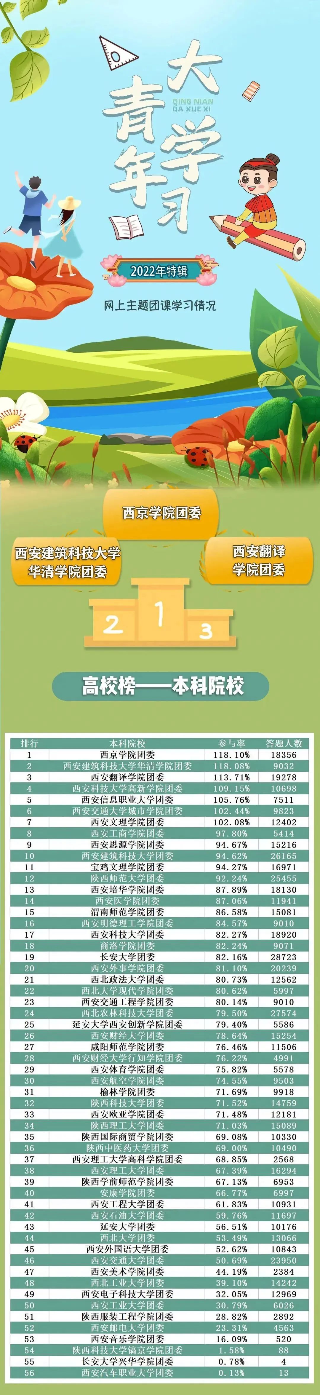在上期的“青年大学习”中,西安培华学院团委排名第13名;参与率87.89%,答题人数18130次,各学院还需继续努力。希望各二级学院团委能更加积极广泛地动员好团员青年参与到“大学习”中,让团员青年更好地学习党的理论与主张。