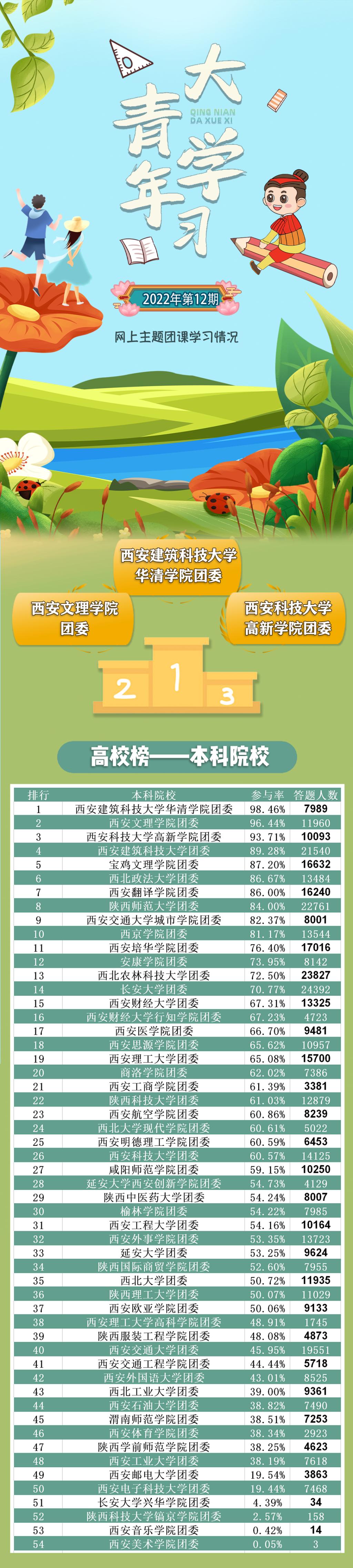 在上期的“青年大学习”中,西安培华学院团委排名第11名;参与率76.40%,答题人数17016次,各学院还需继续努力。希望各二级学院团委能更加积极广泛地动员好团员青年参与到“大学习”中,让团员青年更好地学习党的理论与主张。