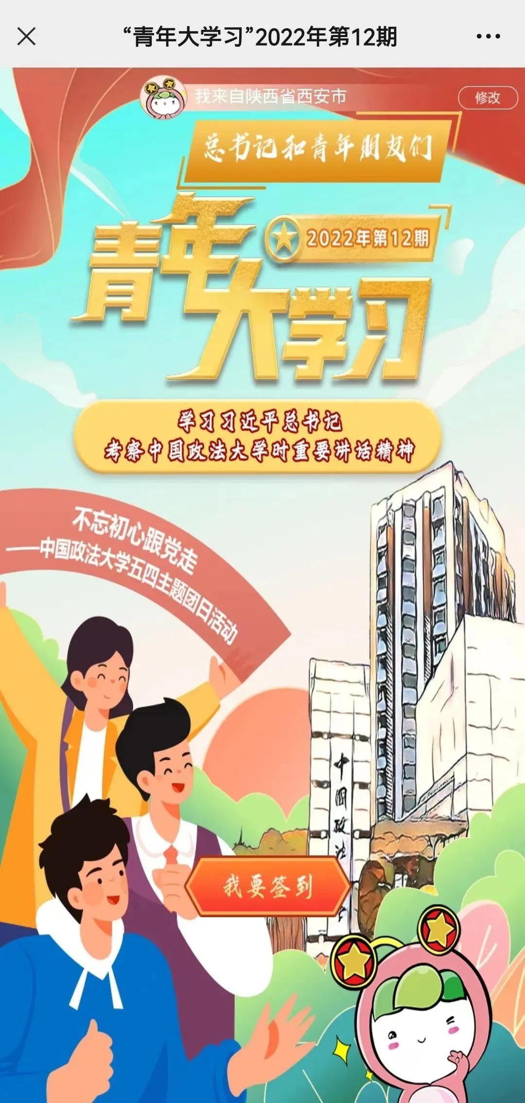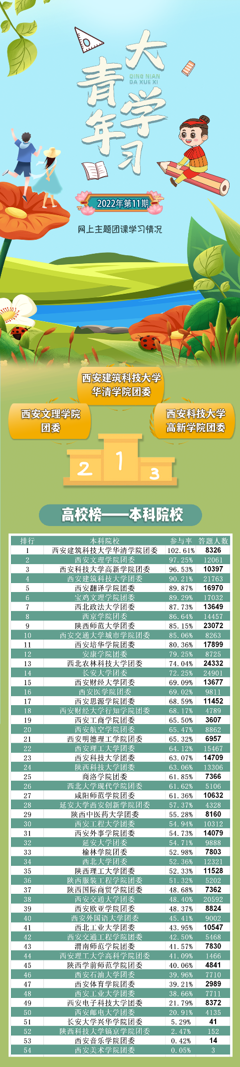 在上期的“青年大学习”中,西安培华学院团委排名第11名;参与率80.36%,答题人数17899次,各学院还需继续努力。希望各二级学院团委能更加积极广泛地动员好团员青年参与到“大学习”中,让团员青年更好地学习党的理论与主张。