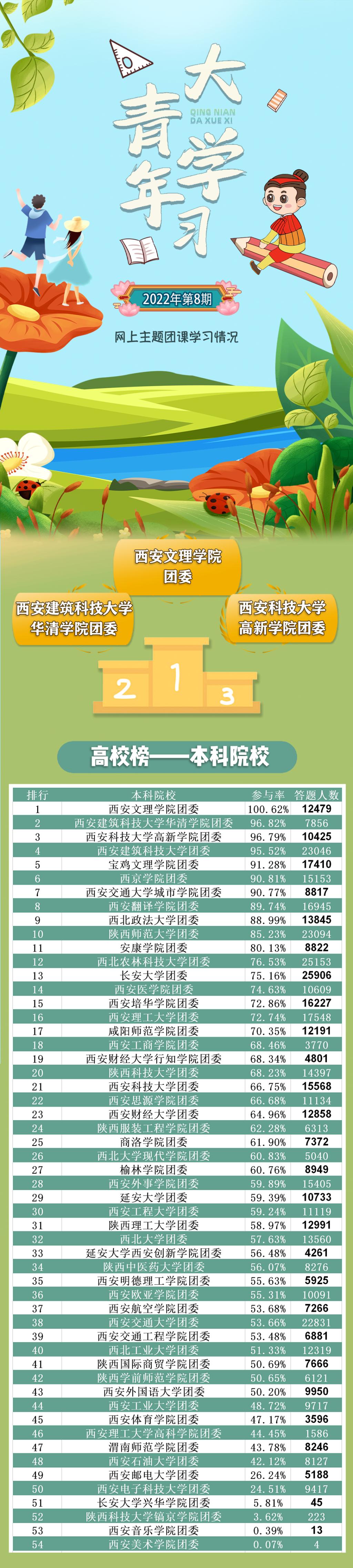 在上期的“青年大学习”中,西安培华学院团委排名第15名;参与率72.86%,答题人数16227次,各学院还需继续努力。希望各二级学院团委能更加积极广泛地动员好团员青年参与到“大学习”中,让团员青年更好地学习党的理论与主张。