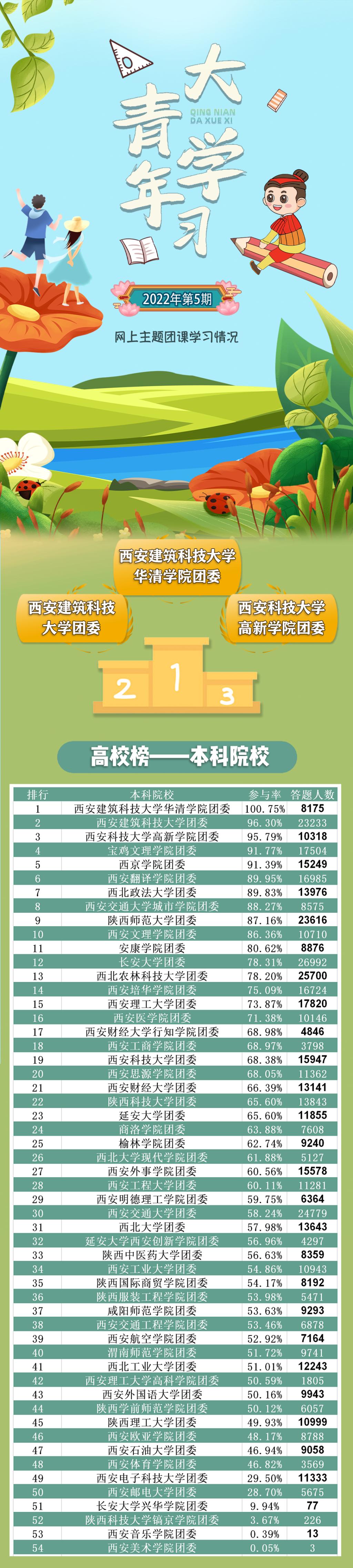 在上期的“青年大学习”中,西安培华学院团委排名第14名;参与率75.09%,答题人数16724次,各学院还需继续努力。希望各二级学院团委能更加积极广泛地动员好团员青年参与到“大学习”中,让团员青年更好地学习党的理论与主张。