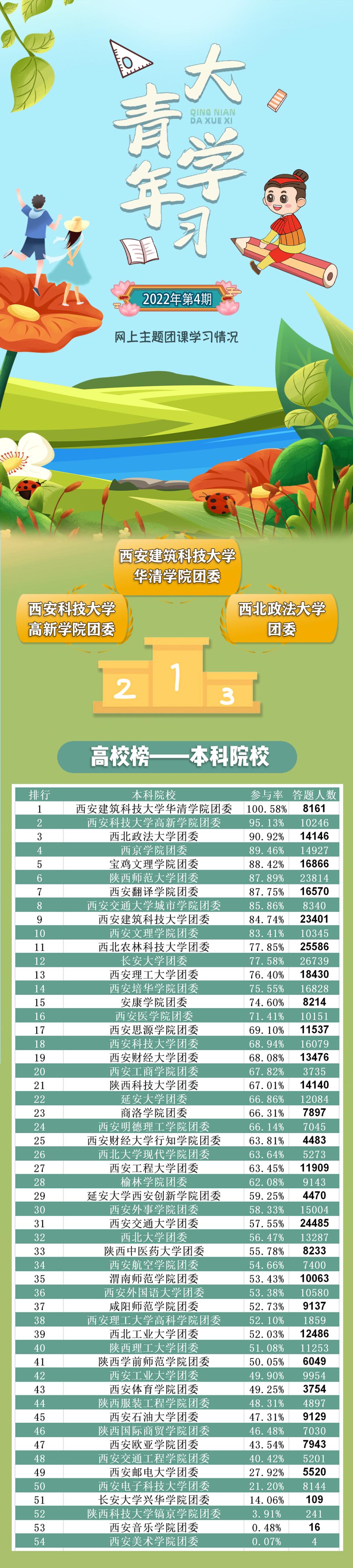 在上期的“青年大学习”中,西安培华学院团委排名第14名;参与率75.55%,答题人数16828次,各学院还需继续努力。希望各二级学院团委能更加积极广泛地动员好团员青年参与到“大学习”中,让团员青年更好地学习党的理论与主张。