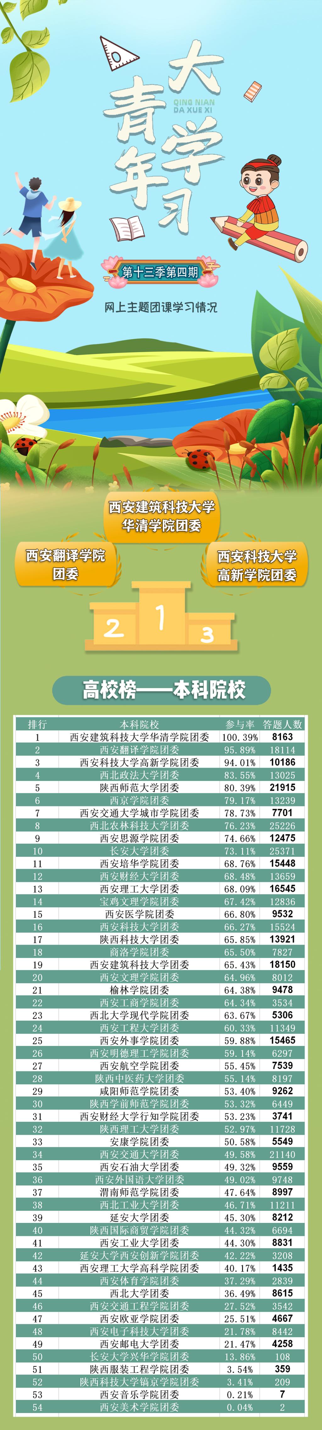 在上期的“青年大学习”中,西安培华学院团委排名第11名;参与率68.76%,答题人数15448次,各学院还需继续努力。希望各二级学院团委能更加积极广泛地动员好团员青年参与到“大学习”中,让团员青年更好地学习党的理论与主张。