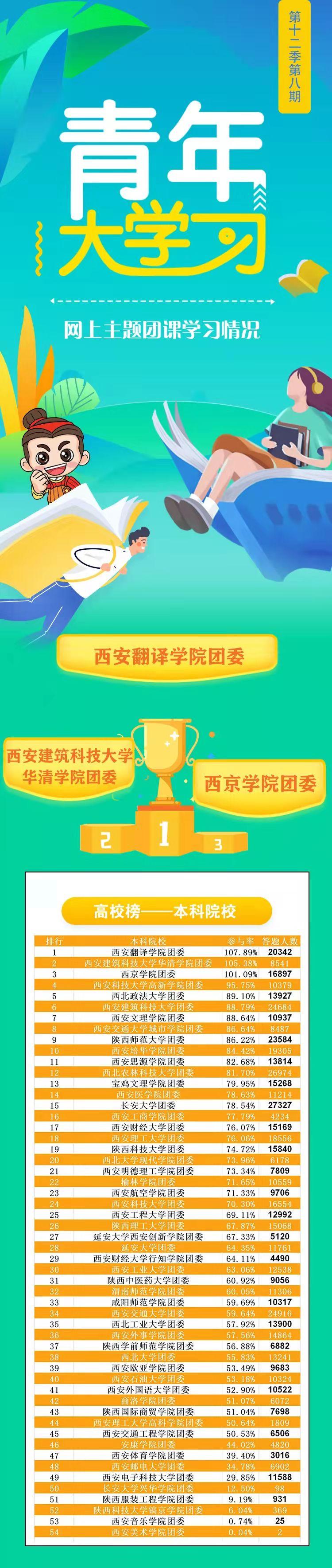 在上期的“青年大学习”中,西安培华学院团委排名第10名;参与率84.42%,答题人数19305次,各学院还需继续努力。希望各二级学院团委能更加积极广泛地动员好团员青年参与到“大学习”中,让团员青年更好地学习党的理论与主张。