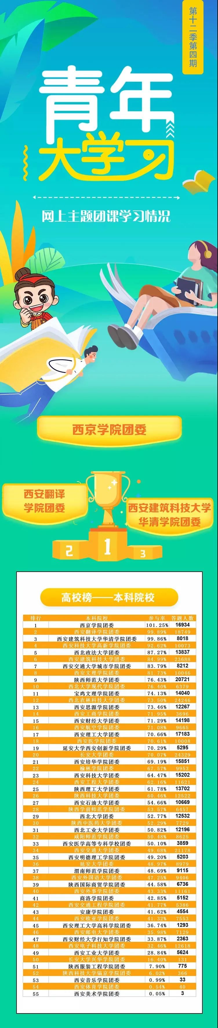 在上期的“青年大学习”中,西安培华学院团委排名第21名;参与率69.19%,答题人数15851次,各学院还需继续努力。希望各二级学院团委能更加积极广泛地动员好团员青年参与到“大学习”中,让团员青年更好地学习党的理论与主张。