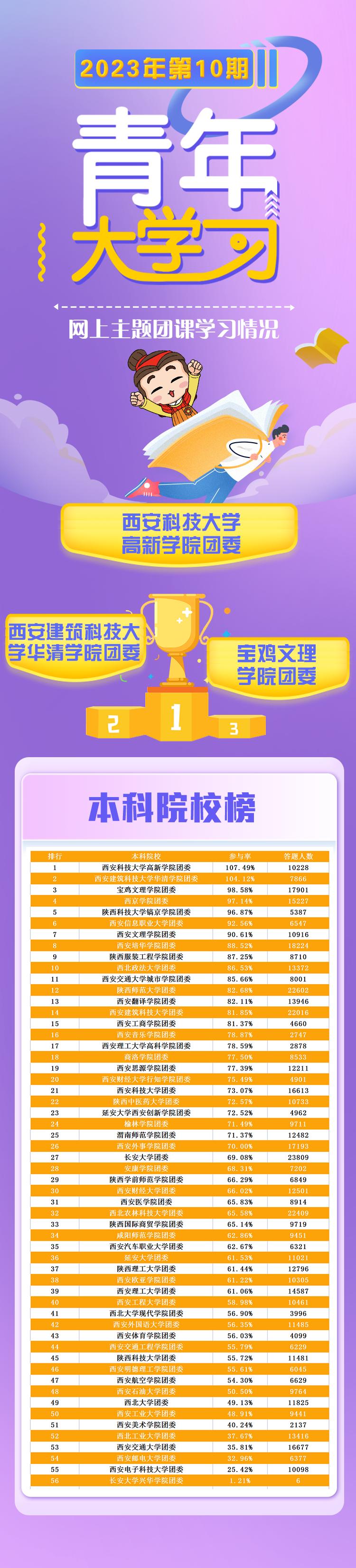 在上期的“青年大学习”中,西安培华学院团委排名第8名;参与率88.52%,答题人数18224次,各学院还需继续努力。希望各二级学院团委能更加积极广泛地动员好团员青年参与到“大学习”中,让团员青年更好地学习党的理论与主张。