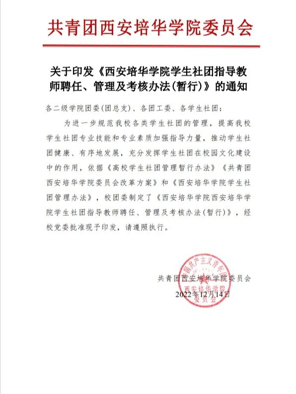 配备配齐社团指导老师,制定了《西安培华学院社团指导老师聘任、管理及考核办法》。