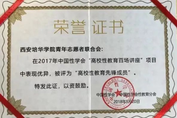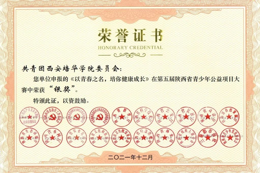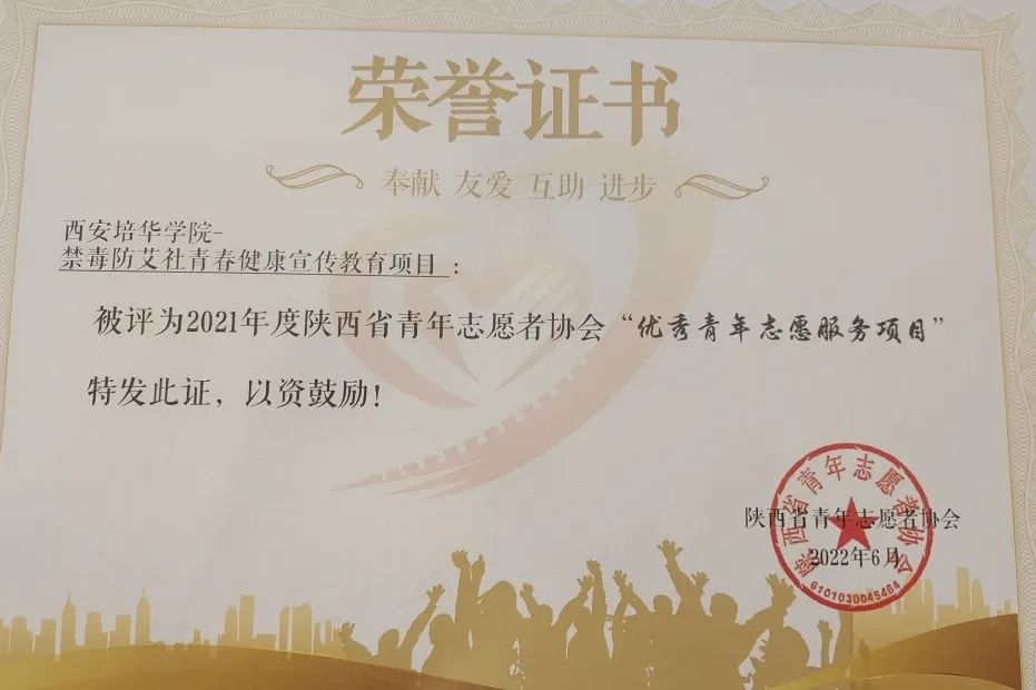 多次获得团中央、团省委奖项,包括:2018年西安市“禁毒防艾”示范高校,2018年暑期三下乡禁毒防艾项目团中央立项,2019年暑期三下乡禁毒防艾项目团中央立项、西省新时代青少年毒品预防教育示范高校,2020-2021年连续两年获陕西省三下乡禁毒防艾专项资助、中国计划生育协会青春健康项目及资助,2021年陕西省第五届青少年公益项目大赛获银奖,2021年度陕西省“优秀青年志愿服务项目”,2022年第六届中国青年志愿服务项目大赛铜奖。