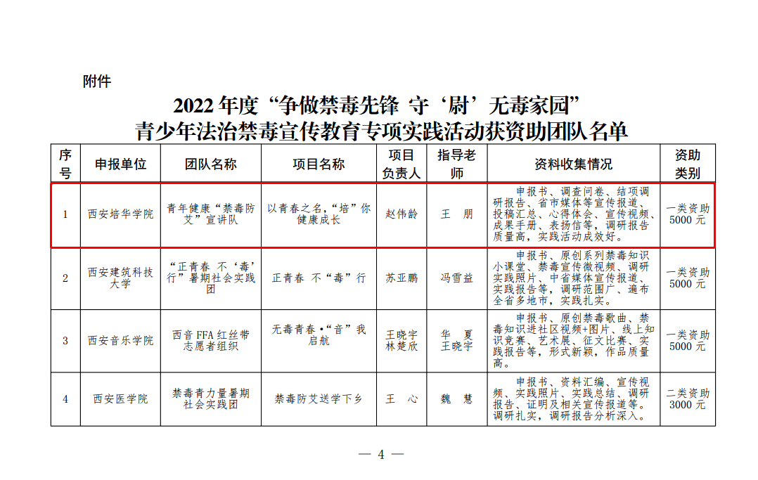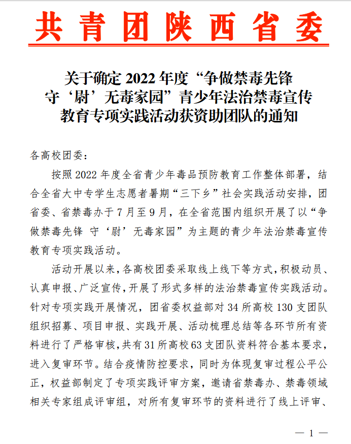 近日,共青团陕西省委发布了《关于确定2022 年度“争做禁毒先锋守‘尉’无毒家园”青少年法治禁毒宣传教育专项实践活动获资助团队的通知》,经评审组综合评定,共评选出一等资助3项、二等资助5项、三等资助22项。其中由学校推荐申报的《以青春之名,“培”你 健康成长》项目脱颖而出,荣获一等资助,位列全省资助项目第一名,这也是学校连续第三年获批的专项资助。