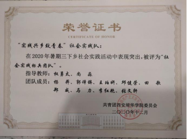 团支部以志愿服务活动为载体,积极引导支部成员参与社会实践。在组织引领下,连续两年带领支部成员参与“三下乡”暑期社会实践活动,其优秀表现受到了各大媒体的广泛关注,媒体累计报道国家级、市级、县级地方和校级文章70余篇,荣获西安培华学院优秀标兵团队荣誉称号。他们以民族复兴为己任,以乡村振兴为干劲,在党和人民最需要的地方绽放绚烂之花。