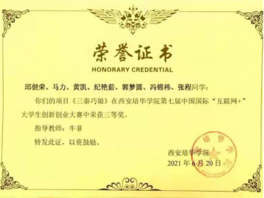 “众人拾柴火焰高”,团支部积极参与各项集体活动。秉承着“团结一致,不卑不亢的精神”,连续两年荣获“先进团支部”荣誉称号和“姜维之班”优秀创建班;在创新创业项目中,“三秦巧娘”传统非遗项目获得三等奖;在社会实践方面,“三下乡”团队连续两年荣获西安培华学院暑期三下乡“优秀标兵团队”荣誉称号。