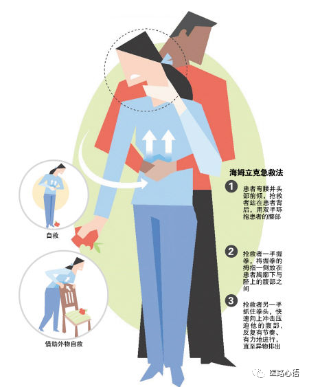 判断:发现患者突然呛咳、不能发声、喘鸣、呼吸急促、皮肤发紫,严重者可迅速出现意识丧失、甚至呼吸心跳停止等情况,这时请马上使用“海姆立克急救法”。