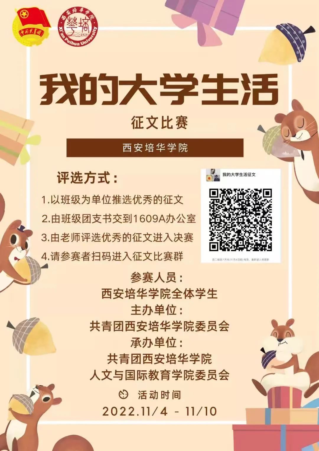 为响应大学生校园文化生活的号召,展现当代大学生的风采,丰富校园文化生活,培养青年文学素养;强化我院学生的专业特长,选拔优秀人才,树立正确的人生观、世界观、价值观。弘扬积极向上的精神,提高自身的涵养,丰富在校学生的课余生活,创建和谐校园,由校团委主办,人文与国际教育学院团委承办“我_____的大学生活”主题征文活动。活动安排如下: