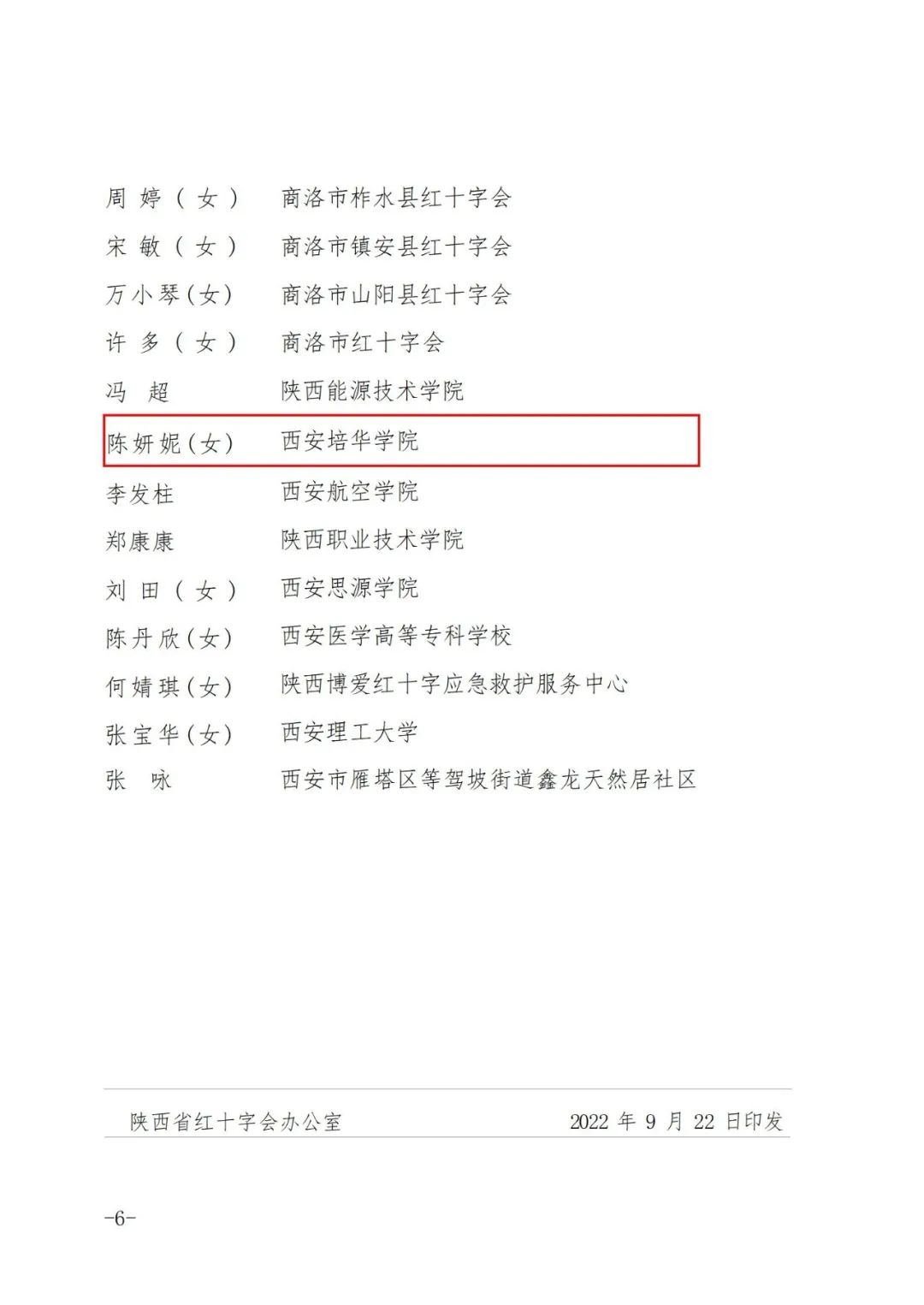 2022年9月22日,陕西省红十字会发布《陕西省红十字会关于表彰陕西省红十字会之星的决定》(陕红发[2022]41号)中,西安培华学院红十字会学生分会成员陈妍妮荣获陕西省红十字“会员之星”荣誉称号。