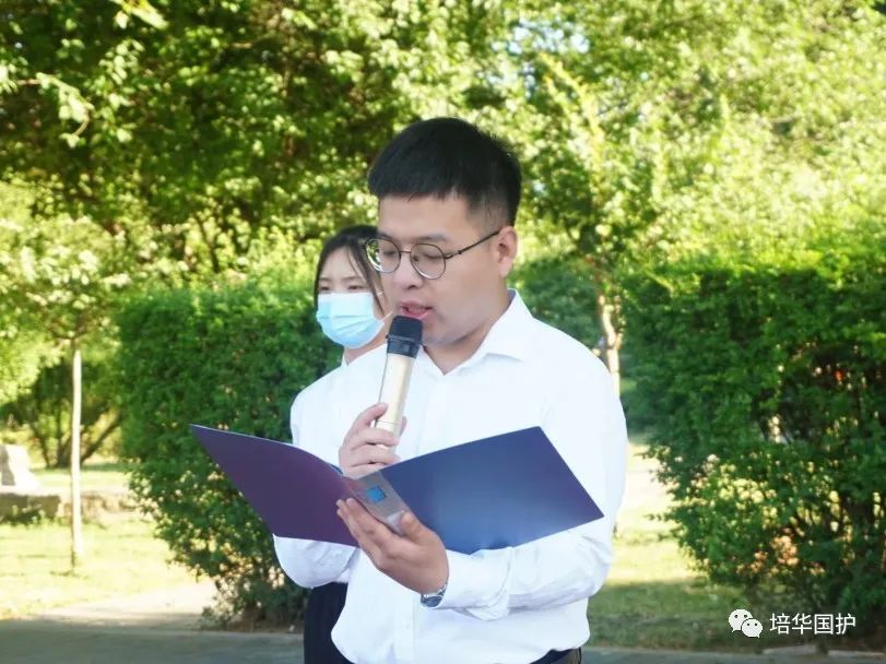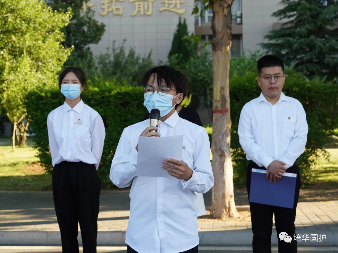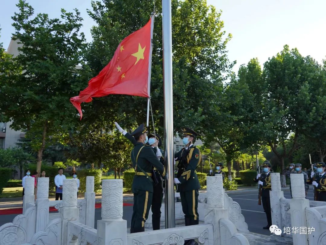 迎着清晨的第一缕阳光,东方出现了瑰丽的朝霞,不远处的树枝沐浴着阳光,那抹轻柔的光投向了树叶,在碧蓝的天空下折射出了清亮的绿光,树叶的微微抖动让阳光在地面上有了婆娑的光影,国旗护卫队队员早早来到南门,静候第十六周升旗仪式的开始。