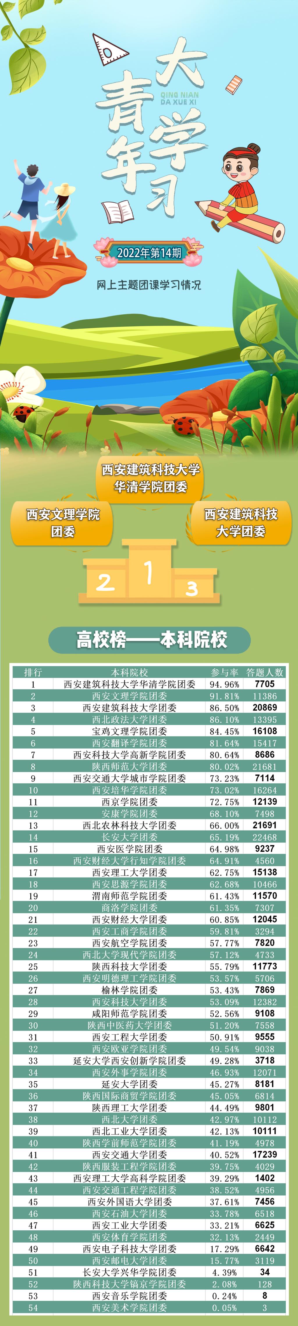 在上期的“青年大学习”中,西安培华学院团委排名第10名;参与率73.02%,答题人数16264次,各学院还需继续努力。希望各二级学院团委能更加积极广泛地动员好团员青年参与到“大学习”中,让团员青年更好地学习党的理论与主张。