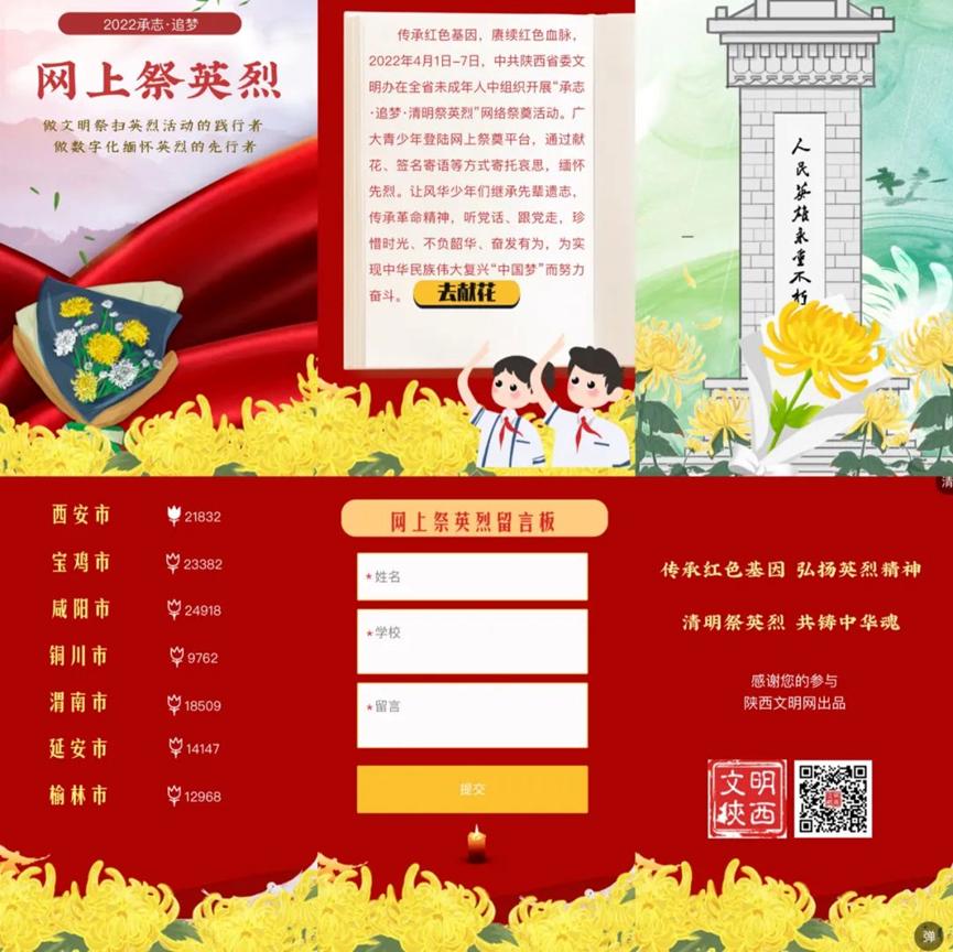 根据省委文明办、省民政厅工作安排,在清明前后集中开展2022年“网络中国节清明”主题活动,积极参与中华英烈网“2022·奋进·网上祭英烈、”陕西文明网“承志·追梦·网上祭英烈”等网上祭扫活动。在此,我们也积极呼吁同学们共同参与,共同缅怀先烈,追思历史。