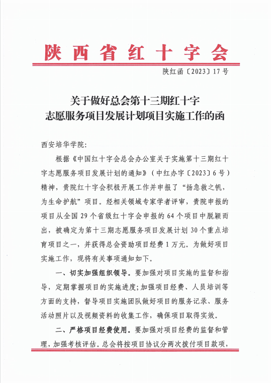 根据中国红十字会总会办公室《关于实施第十三期红十字志愿服务项目发展计划的通知》(中红办字[2023]6号),我校红十字会学生分会积极开展申报工作,经学校和陕西省红十字会推荐,相关领域专家学者评审,我校申报的《扬急救之帆,为生命护航》项目从全国各省市众多项目中脱颖而出,被确定为第十三期志愿服务项目发展计划30 个重点培育项目之一,并获得总会1万元项目经费资助,这也是红十字会学生分会继2020年《阳光成长计划——博爱童行》项目入选“2020年红十字青少年社会实践项目”后的又一突破。