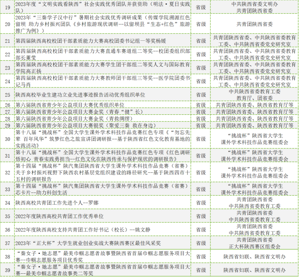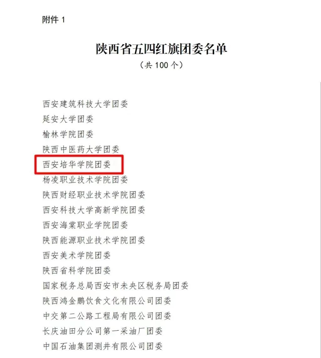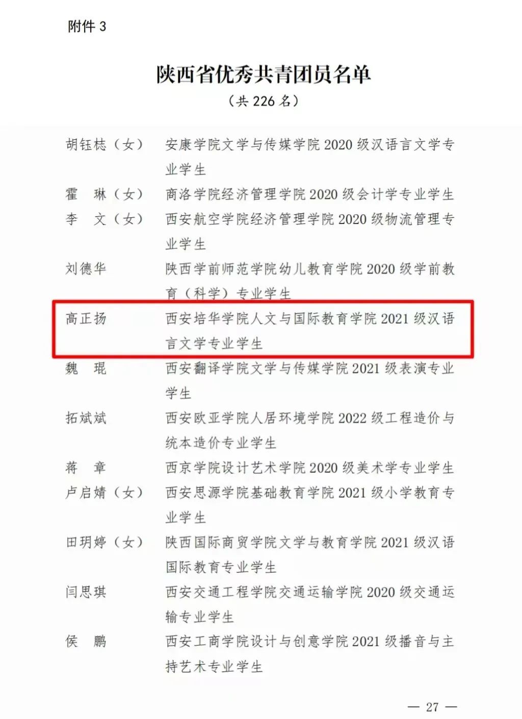 近日,共青团陕西省委下发了《共青团陕西省委关于表彰2022-2023年度陕西省五四红旗团委、陕西省五四红旗团支部、陕西省优秀共青团员、陕西省优秀共青团干部的决定》,西安培华学院团委获评2022-2023年度“陕西省五四红旗团委”荣誉称号,人文与国际教育学院汉语言文学2108团支部书记高正扬同学获评“陕西省优秀共青团员”荣誉称号。