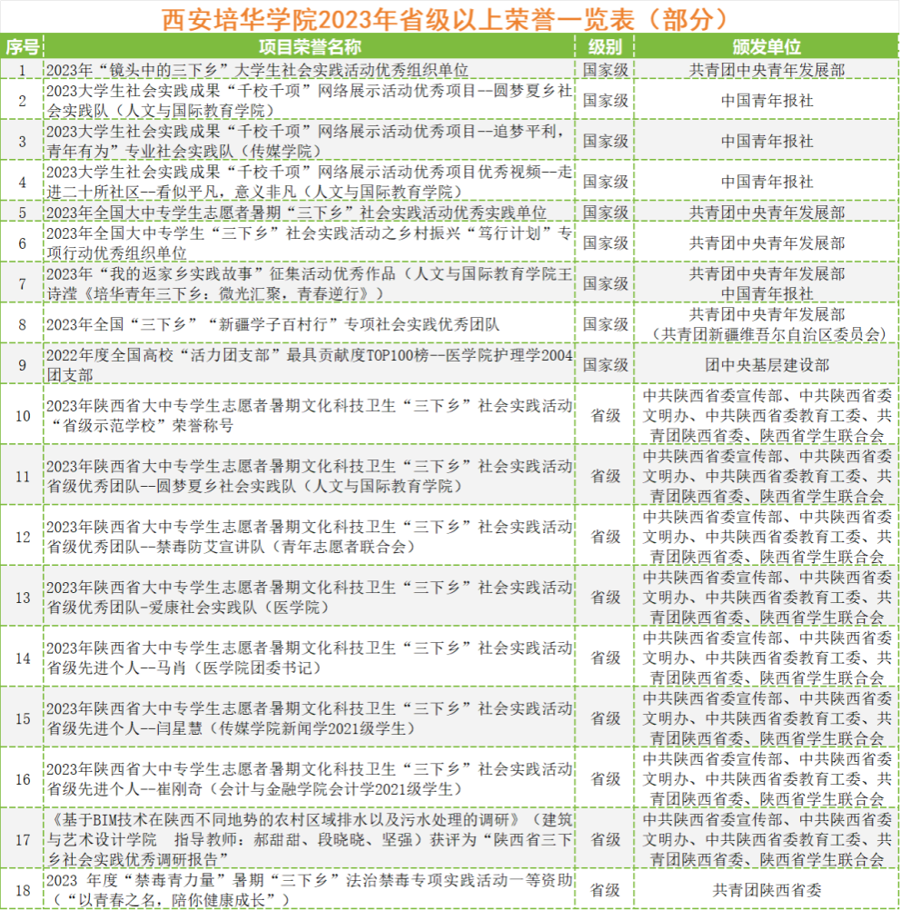 一直以来,校团委在校党委和上级团组织领导下,牢牢把握立德树人根本任务,坚持用习近平新时代中国特色社会主义思想武装青年,在青年思想引领、基层组织建设、联系服务青年等方面持续发力,取得了新进展,实现了新突破。2023年斩获省级以上奖项40余个,其中国家级奖项10余个;先后涌现出“中国大学生自强之星”“陕西高校共青团工作先进个人”“‘三下乡’社会实践活动省级示范学校”等省级以上先进集体、先进个人奖项20余项;打造“青马工程”育人计划、“禁毒防艾”特色志愿服务、“95年95人红旗下的献礼”主题教育宣讲等团学品牌活动数十项;连续五年获评陕西省大学生暑假“三下乡”社会实践活动优秀单位、优秀团队等荣誉称号,自2017年以来,学校连续在陕西省“两红两优”评选中荣获表彰。培华学子用实际行动彰显了新时代青年的青春担当。