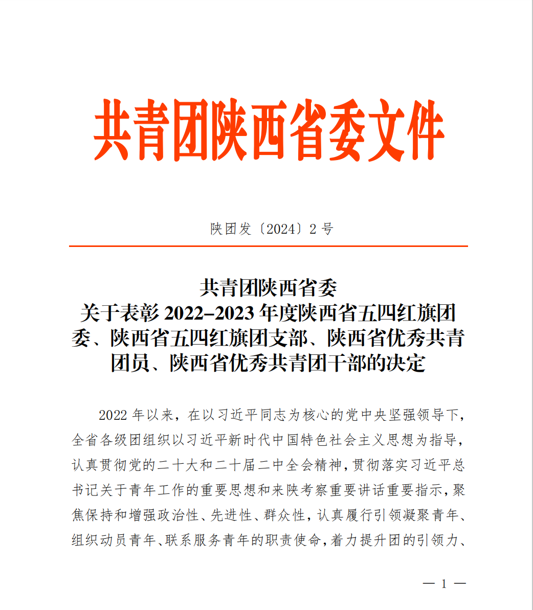时代的考题已经列出,青春的答卷正在写就。连续获评陕西省“两红两优”荣誉是对学校共青团工作的高度认可,更是对各级团干部和团员青年的充分肯定。