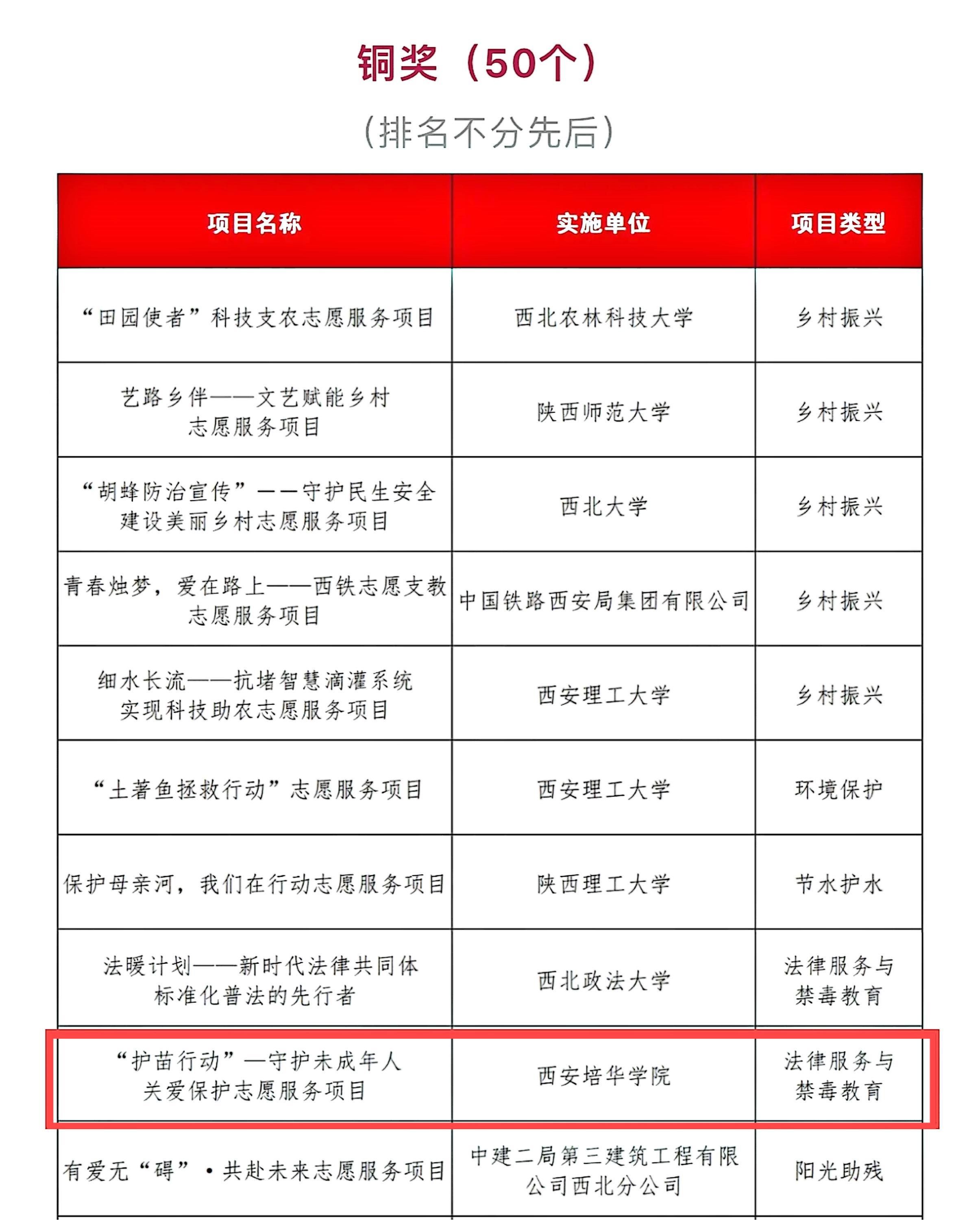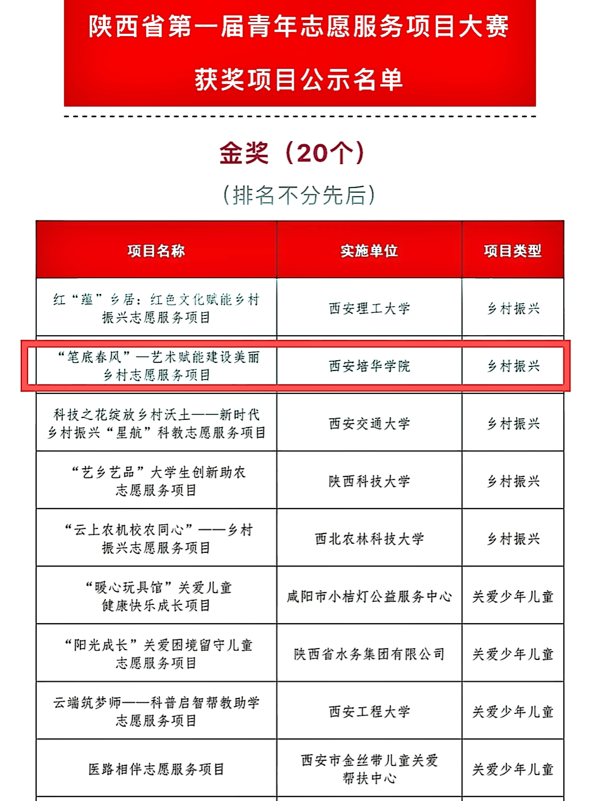 经项目申报、省赛初评、省赛终评、团省委审定,获奖项目名单进行公示,我校荣获一金一铜的好成绩。其中,“笔底春风”-艺术赋能建设美丽乡村志愿服务项目荣获金奖,“护苗行动”-守护未成年人关爱保护志愿服务项目荣获铜奖。
