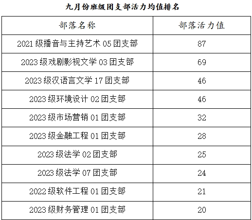 如下表所示,九月份活动参与情况中,2021级、2022级、2023级学生参与活动总人数占比分别为11.53%、47.58%和40.89%。(不含2024级学生)