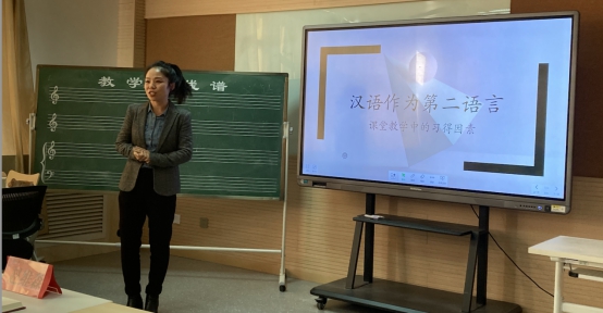 最后,朱君芝老师以“汉语作为第二语言”为主题进行了对外汉语的课堂展示。朱老师在清晰简洁的理论讲解之后,进行了真实的对外汉语课堂模拟,向学生展示如何在课堂中实现“习得”而不单单是“学习”的效果。此外,朱老师还介绍了视频、课堂场地拓展等实现“第二语言习得”效果的教学手段,并精准地总结了实现“习得”的关键要素,即真实、典型、交际。短短一刻钟,却令人受益良多。