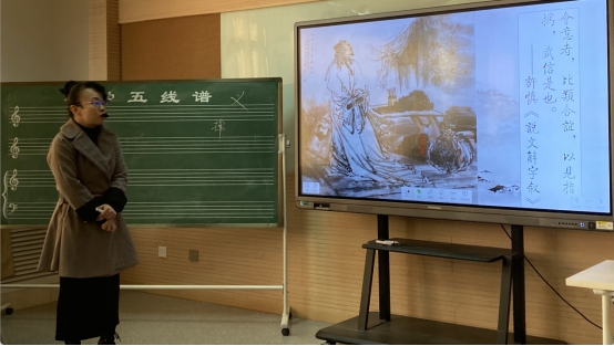 王莉老师率先展示,带来独具韵味的古代汉语课堂示范。王老师以现代对“止戈为武”误读为切入点,引入会意字的讲学。王老师重点讲解了会意字的分类,如以形会意、以义会意、同体会意等,通过生动有趣的拆字解字,将望而生畏的古代汉语变得平易近人、亲切可人。