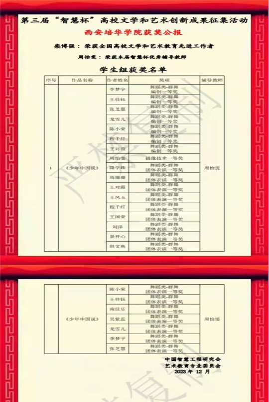 2023在中国智慧工程研究会艺术教育专业委员会举办的“ 智 慧 杯 ”高校文学和艺术作品创新成果征集活动中,西安培华学院报送的群舞《少年中国说》,在众多节目中脱颖而出,喜获一等奖。栾博强老师荣获全国高校文学和艺术教育先进工作者。周怡雯老师荣获智慧杯优秀辅导教师。