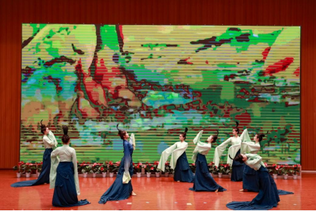 大赛上,来自人文国际教育学院学生社团沐华艺术工坊的同学们为广大师生献上了精彩的艺术舞蹈《只此青绿》。在舞台上,身着青绿衣裙的同学们如同形态曼妙的青翠山峦,她们或轻盈飘逸,或沉稳有力,仿佛与千年前的王希孟跨越时空,共同绘制这幅壮丽的山河画卷。
