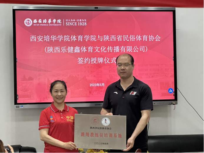 会议开始,首先西安培华学院监事会主席、党委副书记、纪委书记、工会主席、体育工作委员会主任徐国富致欢迎辞。随后,西安培华学院体育学院王志强院长与陕西省民俗体育协会(陕西乐健鑫体育文化传播有限公司)杨坤主席签订合作协议,并授予我院“陕西省民俗体育运动人才培养基地、陕西省跳绳裁判员培训基地、陕西省跳绳教练员培训基地,以及中国跳绳段位制一级专评中心(陕西乐健鑫体育考评点)”。与此同时,我院代表学校向陕西省民俗体育协会授予西安培华学院民俗体育教研学实践基地,之后进行了隆重的授牌仪式。
