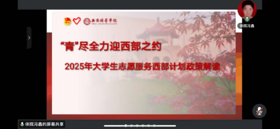 除此之外,大四辅导员冯鑫考虑到学生多处于校外实习的阶段,特别为学生准备了线上直播,鼓励大家在激情与理想之外,也能脚踏实地,做出最适合自己的选择,进而在西部的广阔天地中更好地发光发热。通过线上平台的广泛覆盖,确保了信息的有效传达,让更多即将步入社会的青年学子能够直面了解西部计划的价值。