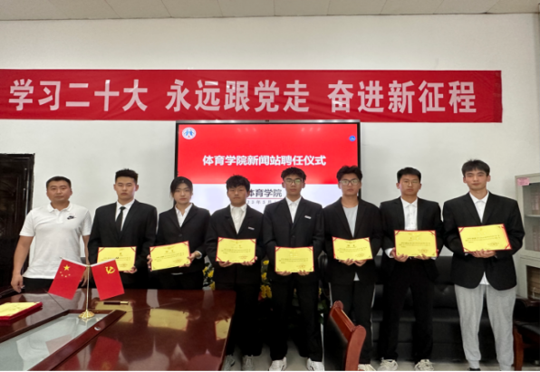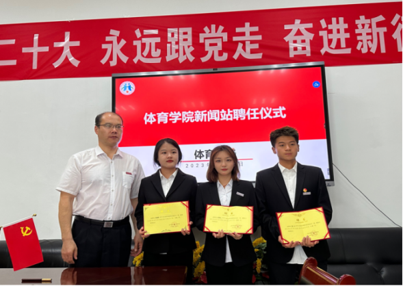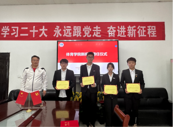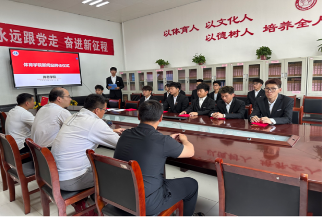 2023年5月15日中午12点半,在体育学院会议室隆重举行了体育学院新闻站成立大会暨聘书颁发大会。出席此次活动的领导有体育学院行政副院长、党支部书记马德厚,体育学院办公室主任刘毅,体育学院信息安全专员、学院网站管理员张战涛,体育学院大一年级辅导员丁景阳老师。