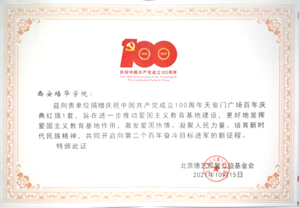 北京德艺双馨公益基金会向西安培华学院捐赠了一面天安门广场百年庆典红旗。全国政协委员、中华人民共和国国史学会秘书长张星星,陕西省十届人大常委会副主任邓理,中共陕西省委教育工作委员会、陕西省教育厅二级巡视员罗侃淳,北京德艺双馨公益基金会理事长范晓伟,北京德艺双馨公益基金会秘书长李杨,培华学院全体校领导及新生代表参加了捐赠仪式。