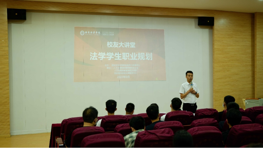 9月28日下午校友服务与发展中心联合人文与国际教育学院特邀请2013届法学专业校友、华格律师事务所主任李涵宇在博远楼J201举办了一场关于法学毕业生职业规划讲座,人文与国际教育学院行政副院长南兵、教学副院长赵洁、法学系主任马亚乐及近八十位2023届法学专业毕业生参加了此次讲座。