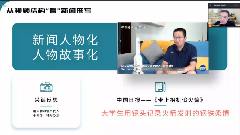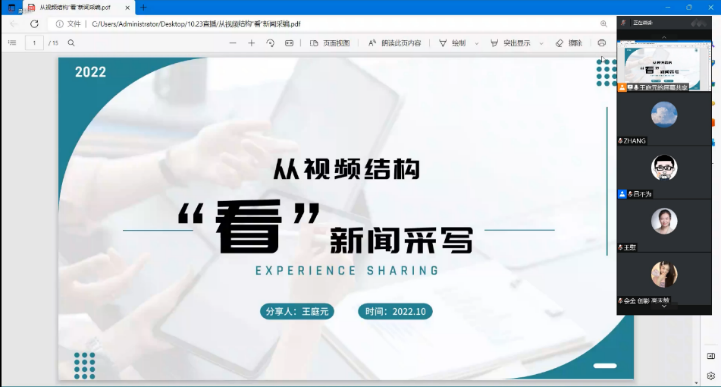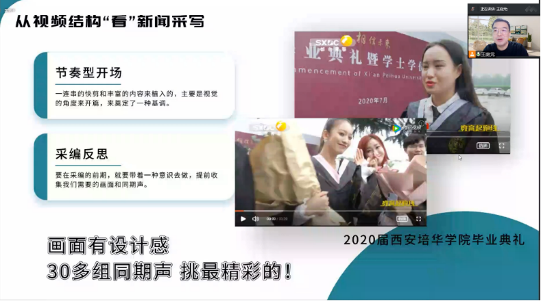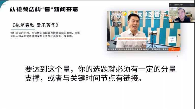 王庭元校友用充满激情的语言,通过聊天的方式,引用了大量生动的例子,从划不走、讲故事、说干货、持续升华、精神传承包容五个方面,就视频新闻如何采写这一话题,展开了内容,他说为使视频新闻信息形成独特的风格,新闻编辑必须创新思路,寻找切口,注重细节,代入节奏,并增加自身对于新闻的素质和能力要求。我们写出好新闻,做好宣传思想工作,就要牢牢把握主动权,主动出击,等新闻出现,不如出去找新闻。树立创新思维,心中要常有好思路,想别人想不到的。