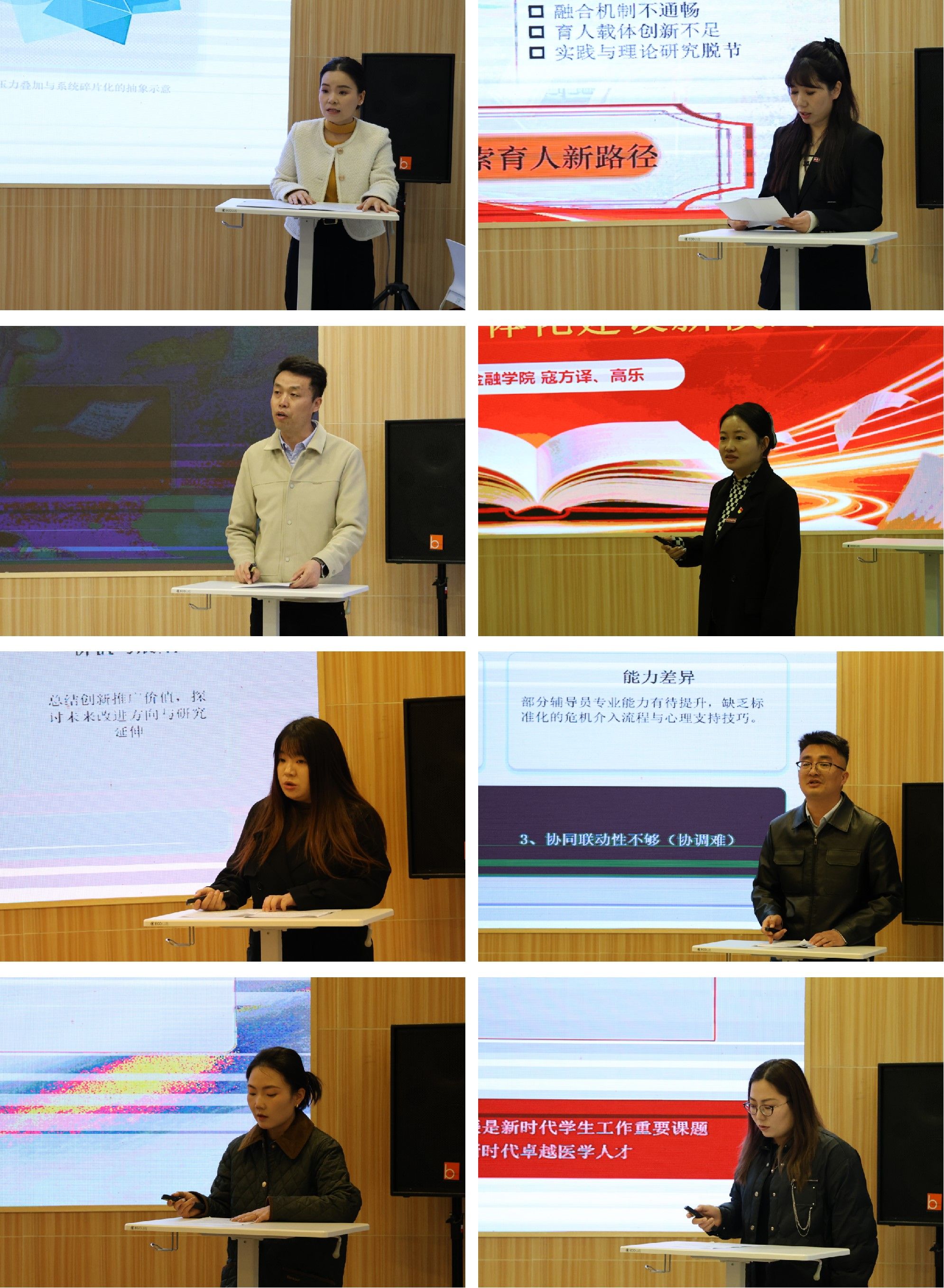 答辩环节中,各辅导员老师围绕班团一体化、心理危机干预、谈心谈话技巧、学生干部培养、人工智能赋能、职业生涯规划与就业指导等多个具体工作,从背景理念、实施路径、实践成效及创新亮点等方面进行全面阐述,充分展现了扎实的专业素养与丰富的育人实践经验。
