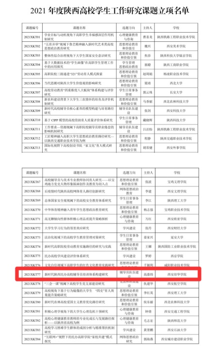根据《关于公布2021年度陕西高校学生工作精品项目和研究课题立项名单的通知》的文件,我校党委学生工作部蔡亮主持的《三聚三融联动:红色基因融入大学生爱国主义教育实践研究》获得“学生工作精品项目”立项,传媒学院高嘉炜主持的《 新时代陕西民办高校辅导员培训体系构建研究》获得“学生工作研究课题”立项。
