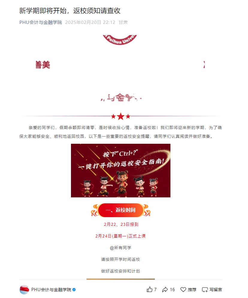 学校通过官网、微信公众号、班级群等多渠道,及时、广泛地向学生传达安全提示内容,确保每一位学生都能知晓并重视。安全提示涵盖了学生返校途中和返校后的多个关键安全领域,包括交通安全、食品安全、财产安全、传染病预防、电信诈骗预防等。为将安全工作落到实处,校院两级还组织人员对校园进行了全面的安全隐患排查,包括教学楼、实验室、图书馆、食堂、学生公寓等重点区域,对发现的问题及时整改。同时,加强校园巡查力度,增加巡查频次,确保校园安全稳定。