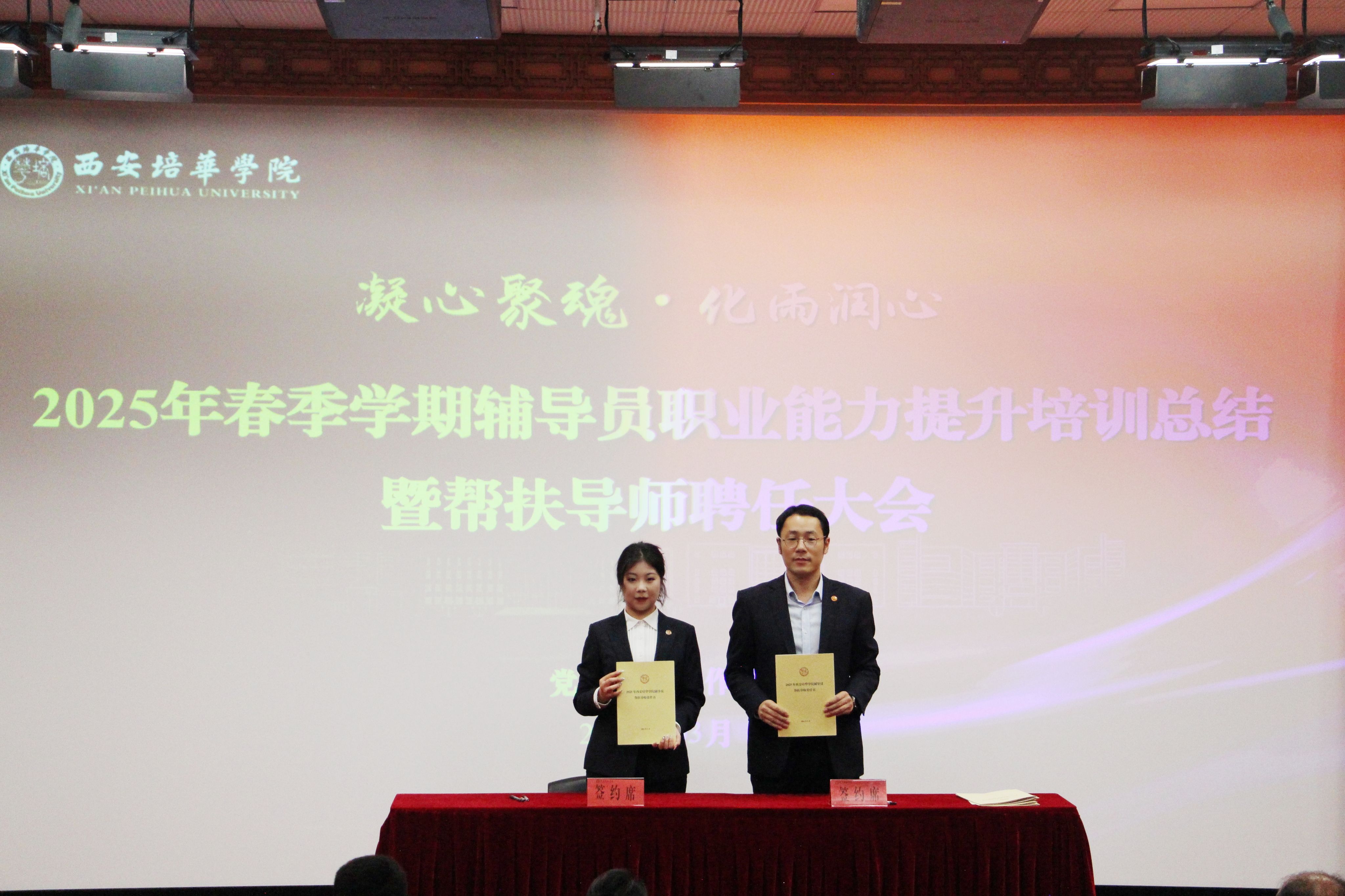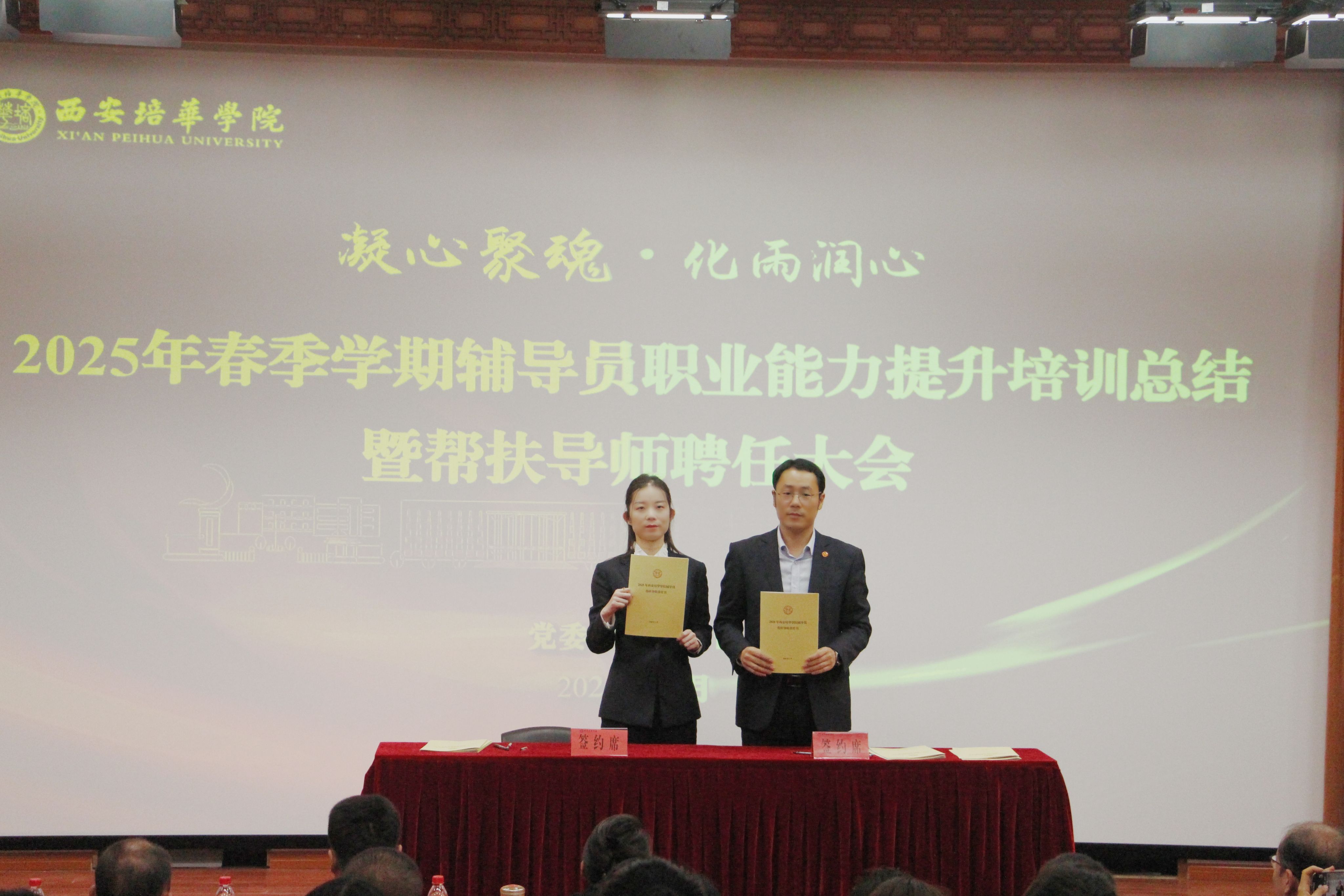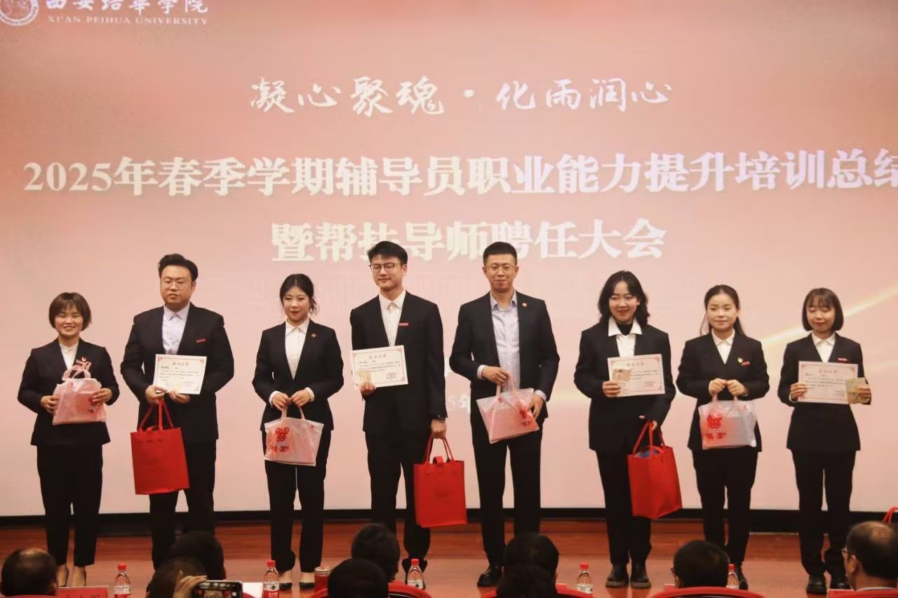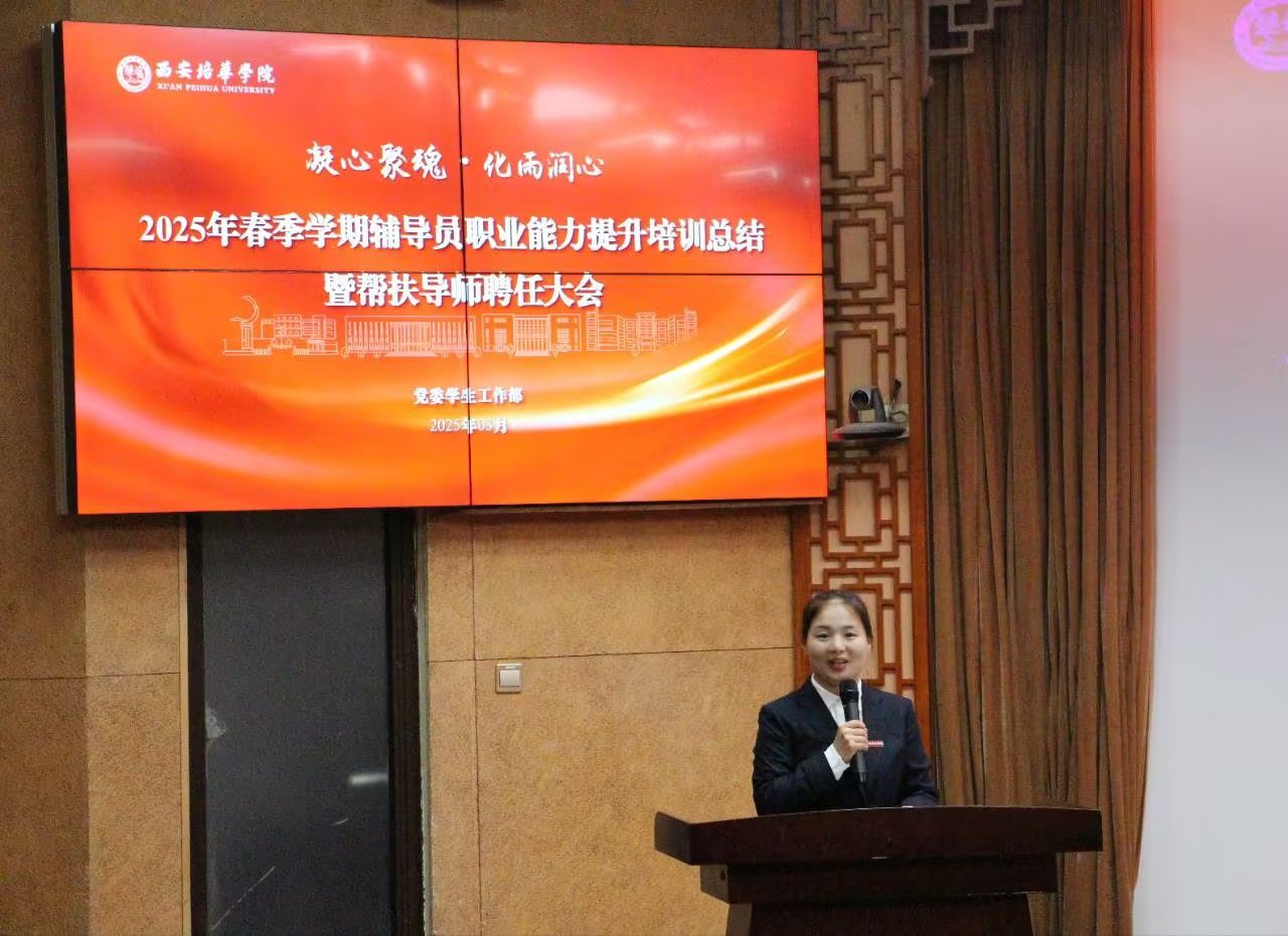 为进一步加强学校辅导员队伍建设,夯实新入职辅导员的业务培训和理论提升,促进新入职辅导员快速熟悉大学生思想政治教育政策、规律和方法,帮助新入职辅导员深入了解岗位职责和任务目标,3月14日,在汇知楼国学大讲堂举行了“西安培华学院 2025 年春季学期辅导员职业能力提升培训总结暨帮扶导师聘任大会”。我校党委副书记、副校长姚文静教授,党委学工部部长权勇太,副部长杨媛,校团委书记董莹,各二级学院党委(党总支)书记、副书记,全体辅导员参加了此次大会。大会由学工部副部长杨媛主持。