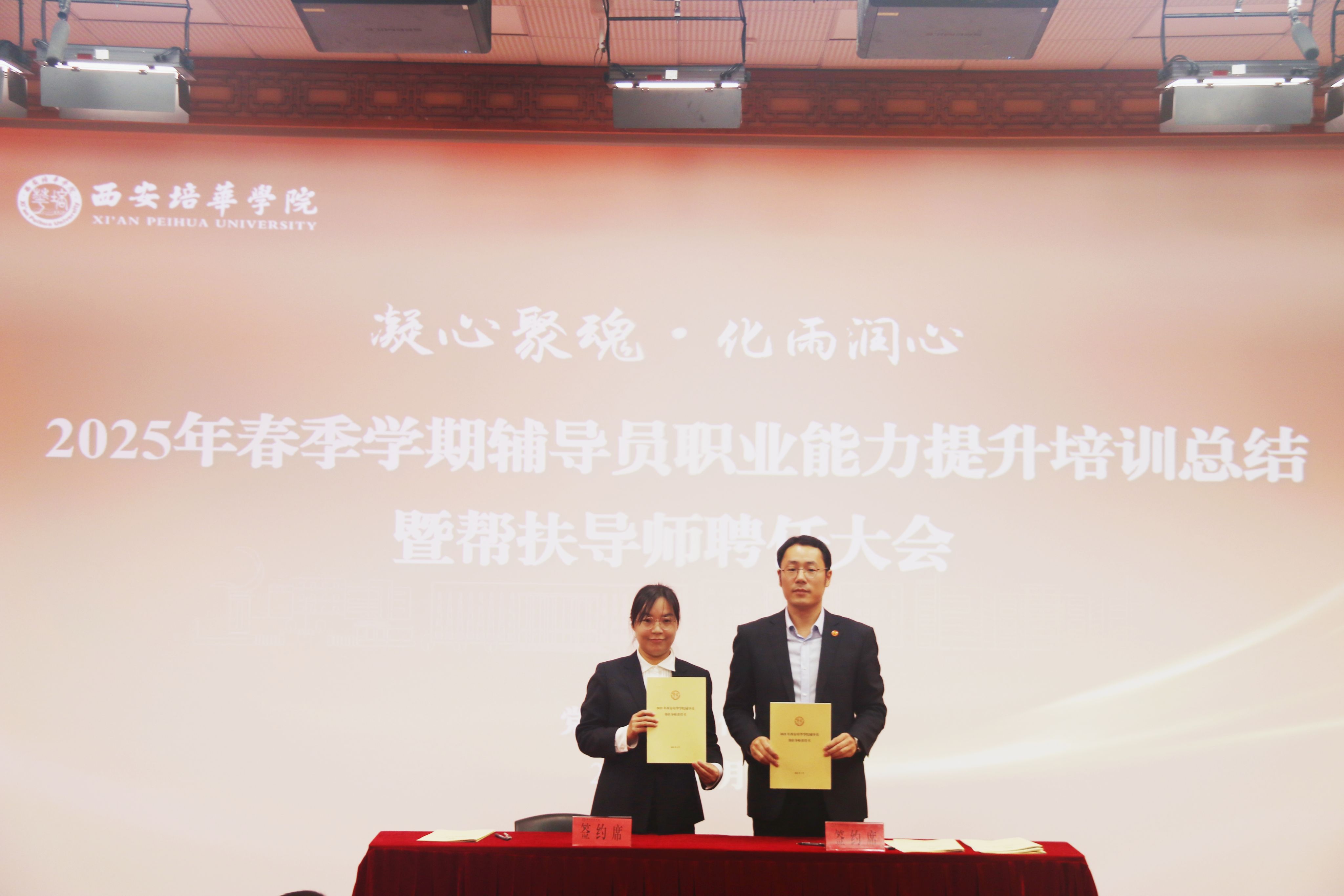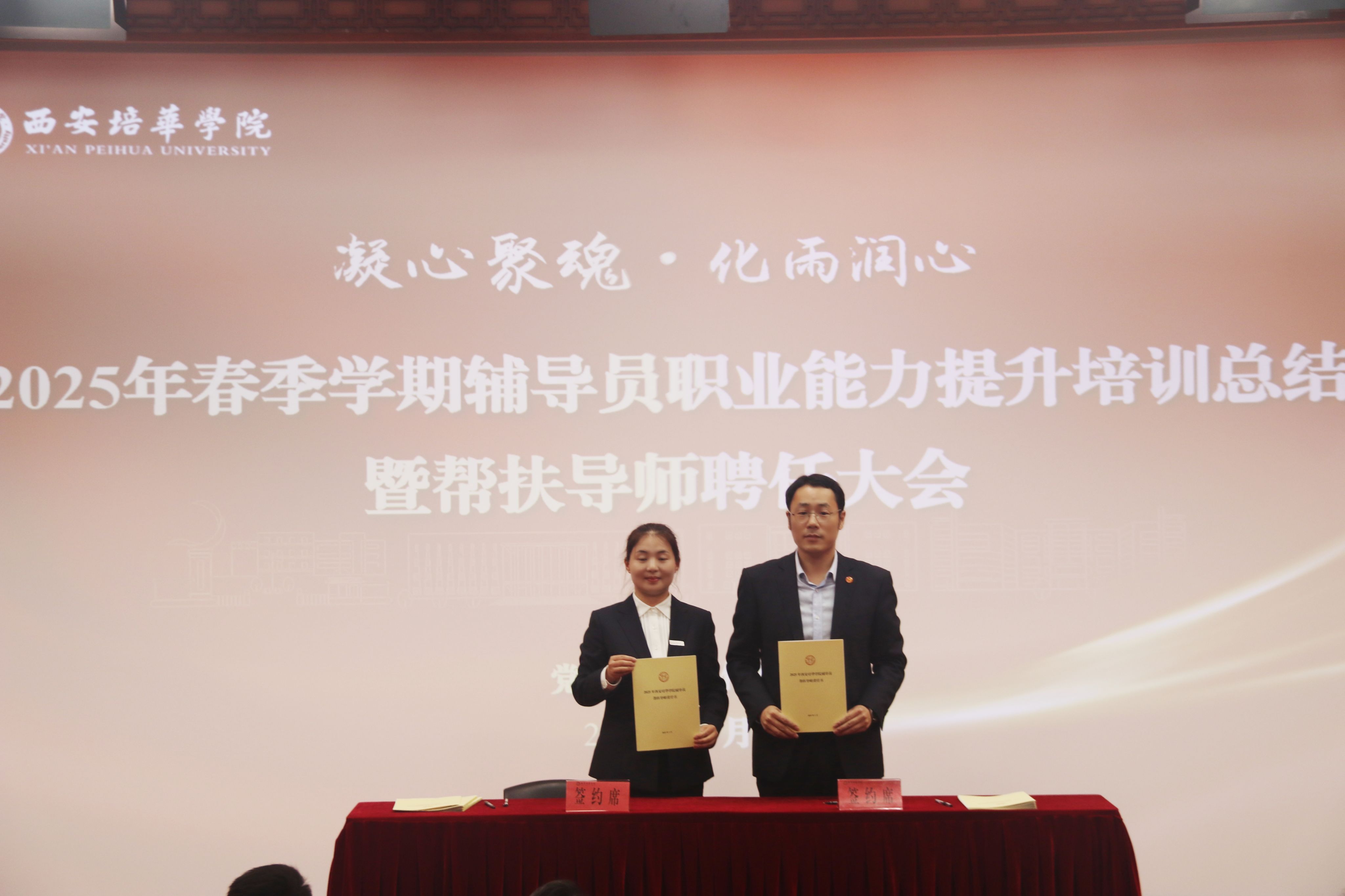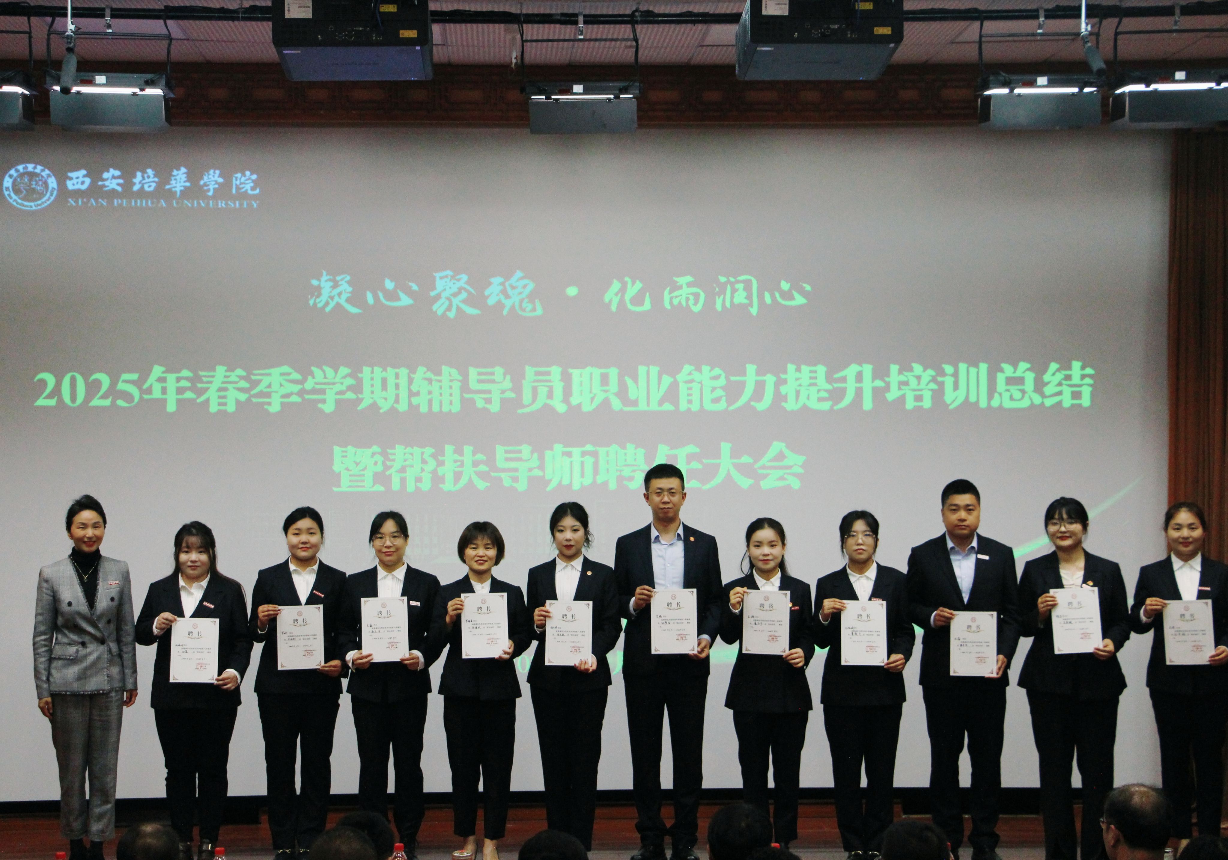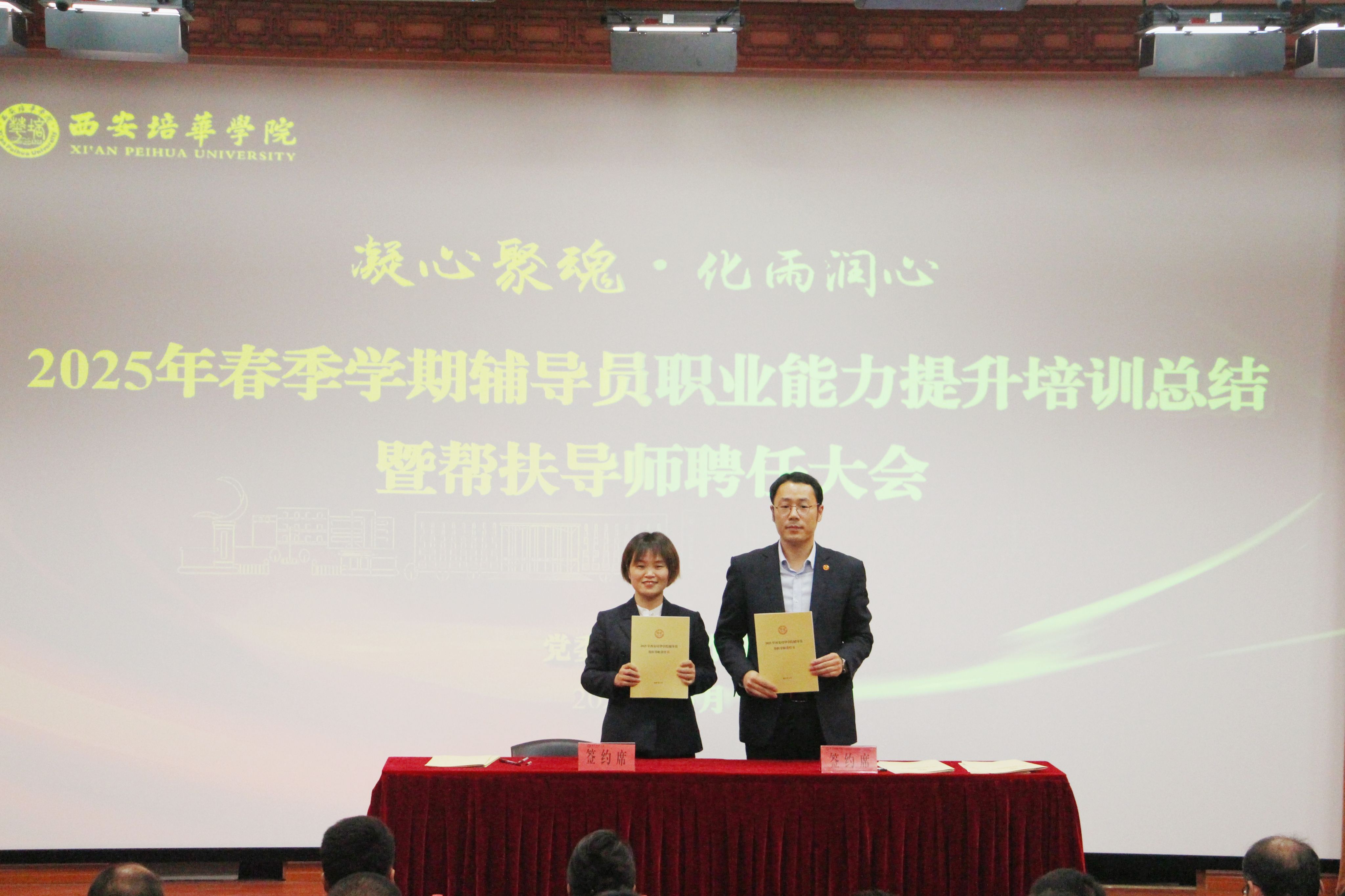 为进一步加强学校辅导员队伍建设,夯实新入职辅导员的业务培训和理论提升,促进新入职辅导员快速熟悉大学生思想政治教育政策、规律和方法,帮助新入职辅导员深入了解岗位职责和任务目标,3月14日,在汇知楼国学大讲堂举行了“西安培华学院 2025 年春季学期辅导员职业能力提升培训总结暨帮扶导师聘任大会”。我校党委副书记、副校长姚文静教授,党委学工部部长权勇太,副部长杨媛,校团委书记董莹,各二级学院党委(党总支)书记、副书记,全体辅导员参加了此次大会。大会由学工部副部长杨媛主持。