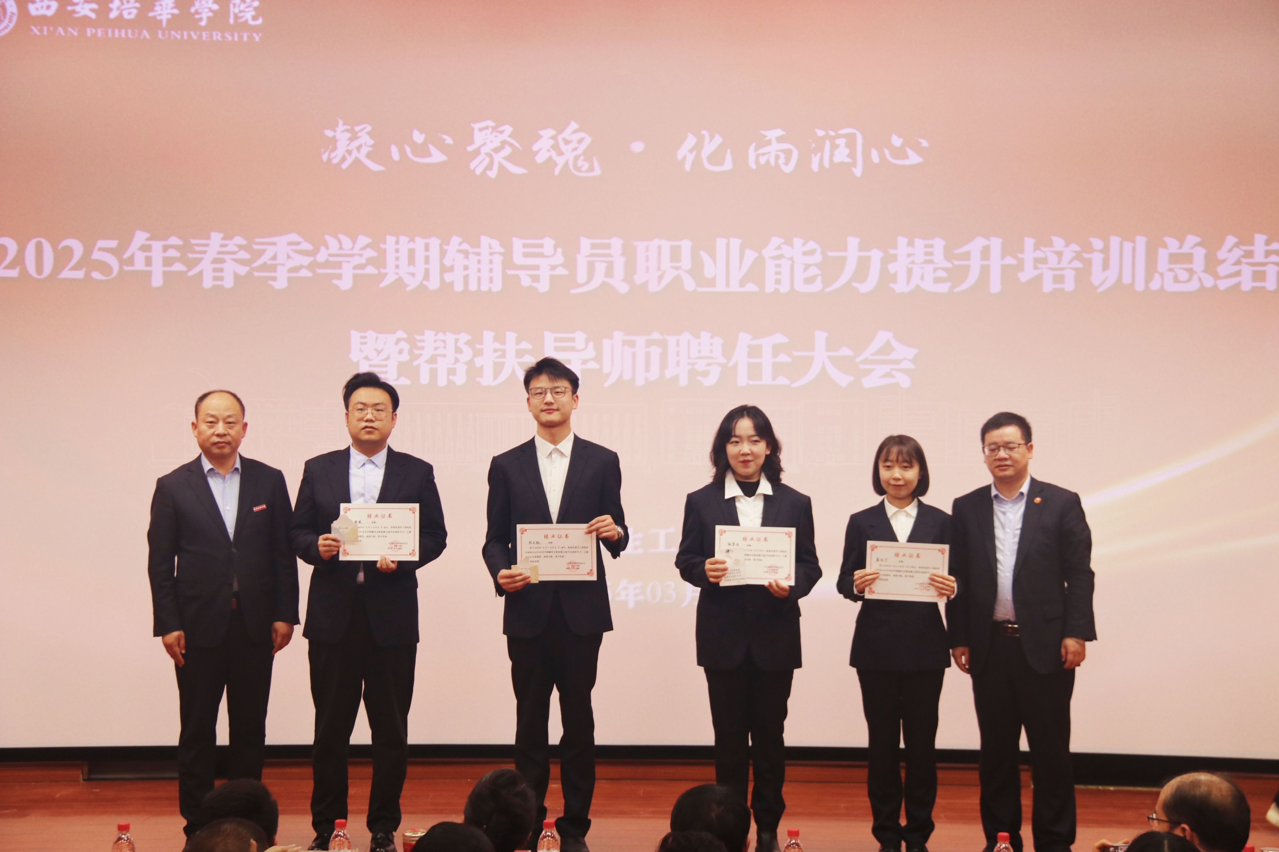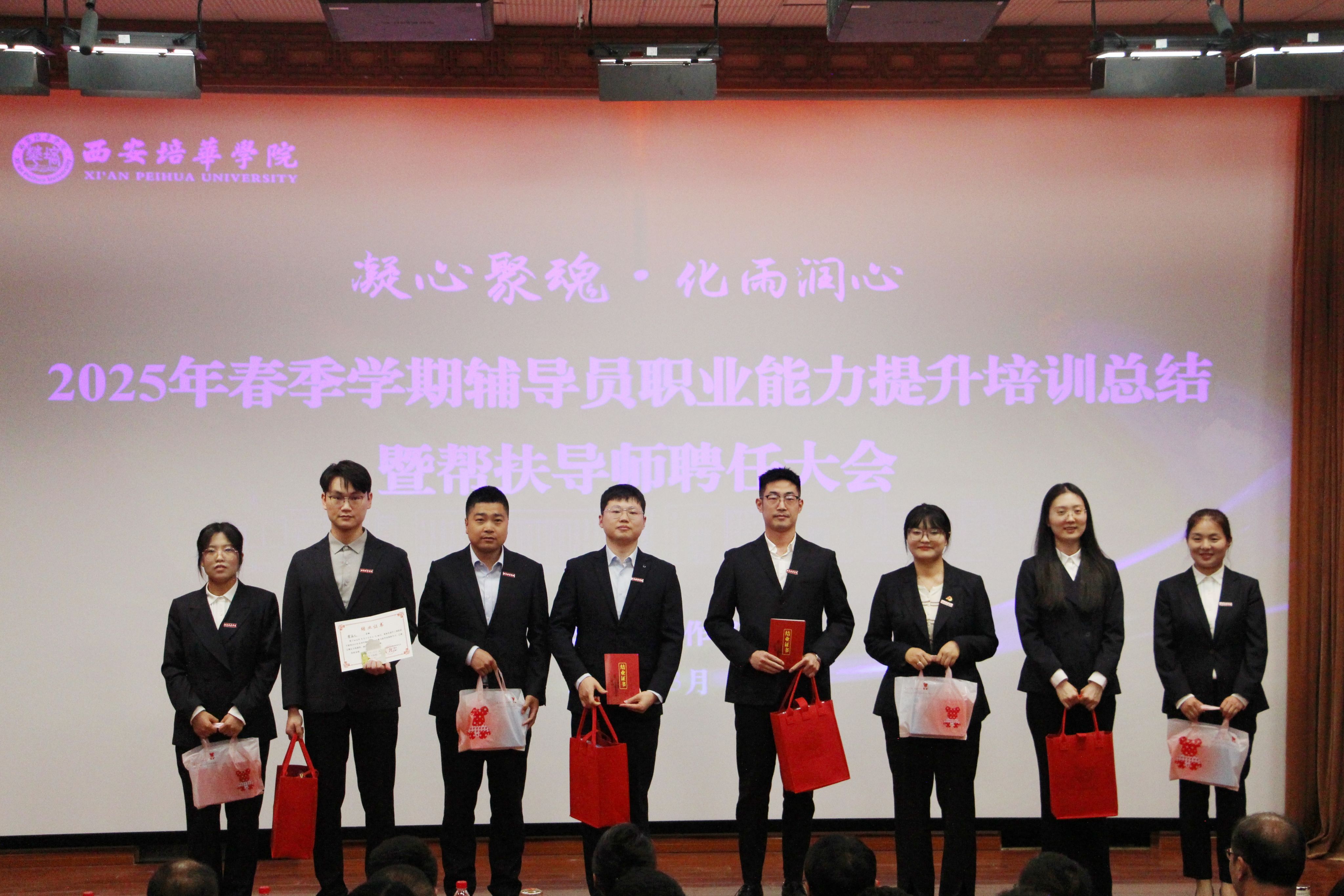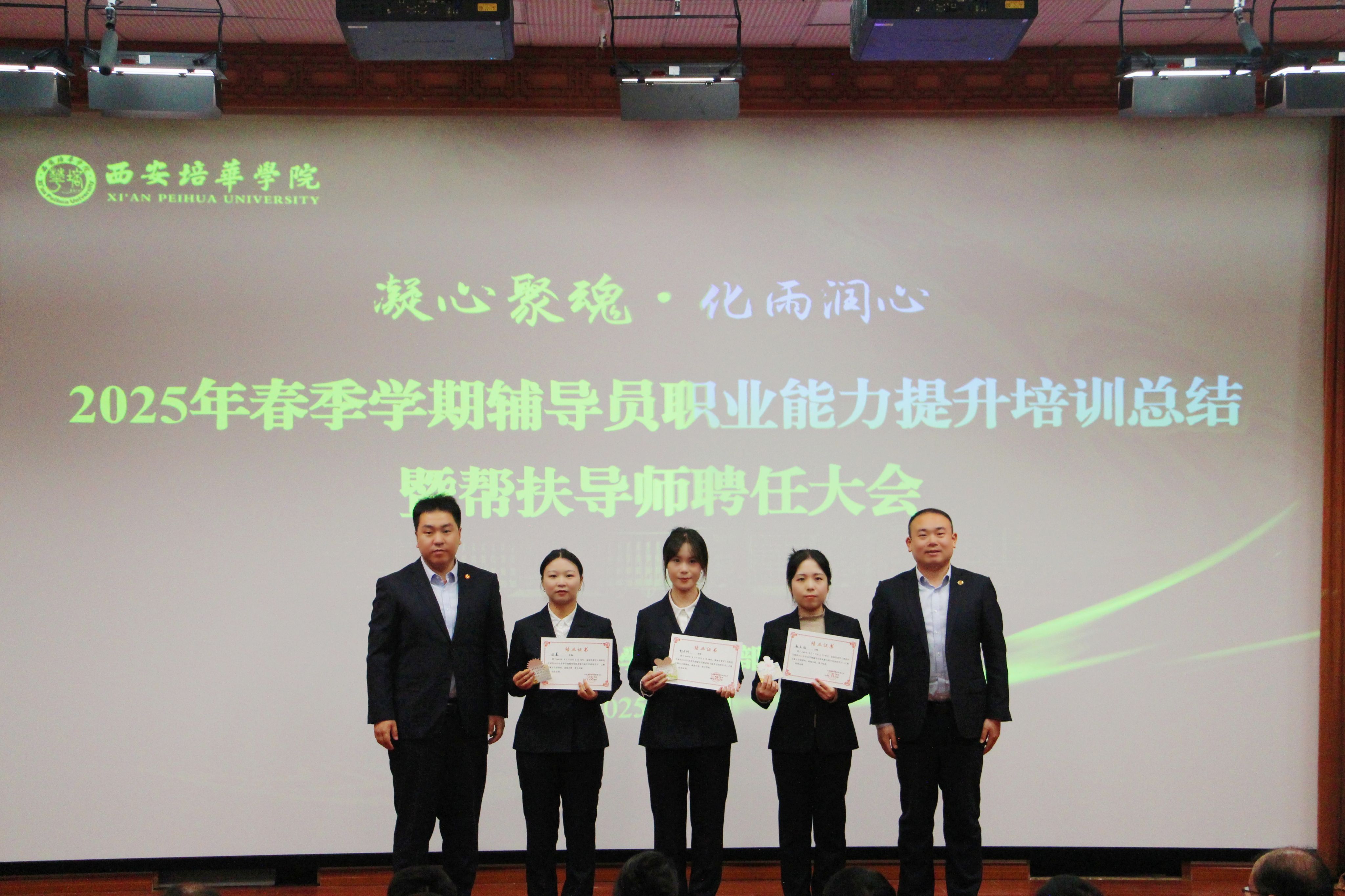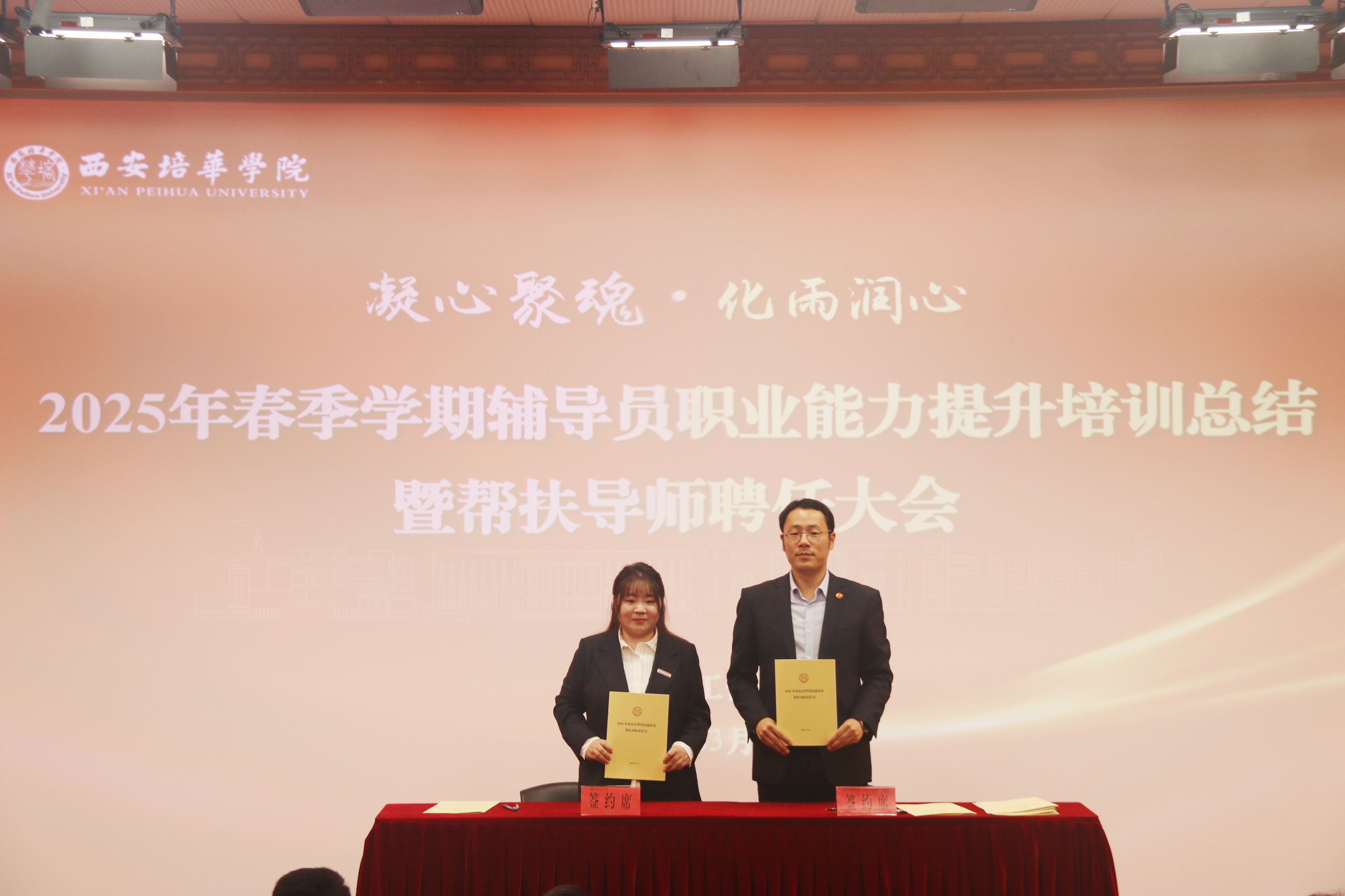 为进一步加强学校辅导员队伍建设,夯实新入职辅导员的业务培训和理论提升,促进新入职辅导员快速熟悉大学生思想政治教育政策、规律和方法,帮助新入职辅导员深入了解岗位职责和任务目标,3月14日,在汇知楼国学大讲堂举行了“西安培华学院 2025 年春季学期辅导员职业能力提升培训总结暨帮扶导师聘任大会”。我校党委副书记、副校长姚文静教授,党委学工部部长权勇太,副部长杨媛,校团委书记董莹,各二级学院党委(党总支)书记、副书记,全体辅导员参加了此次大会。大会由学工部副部长杨媛主持。