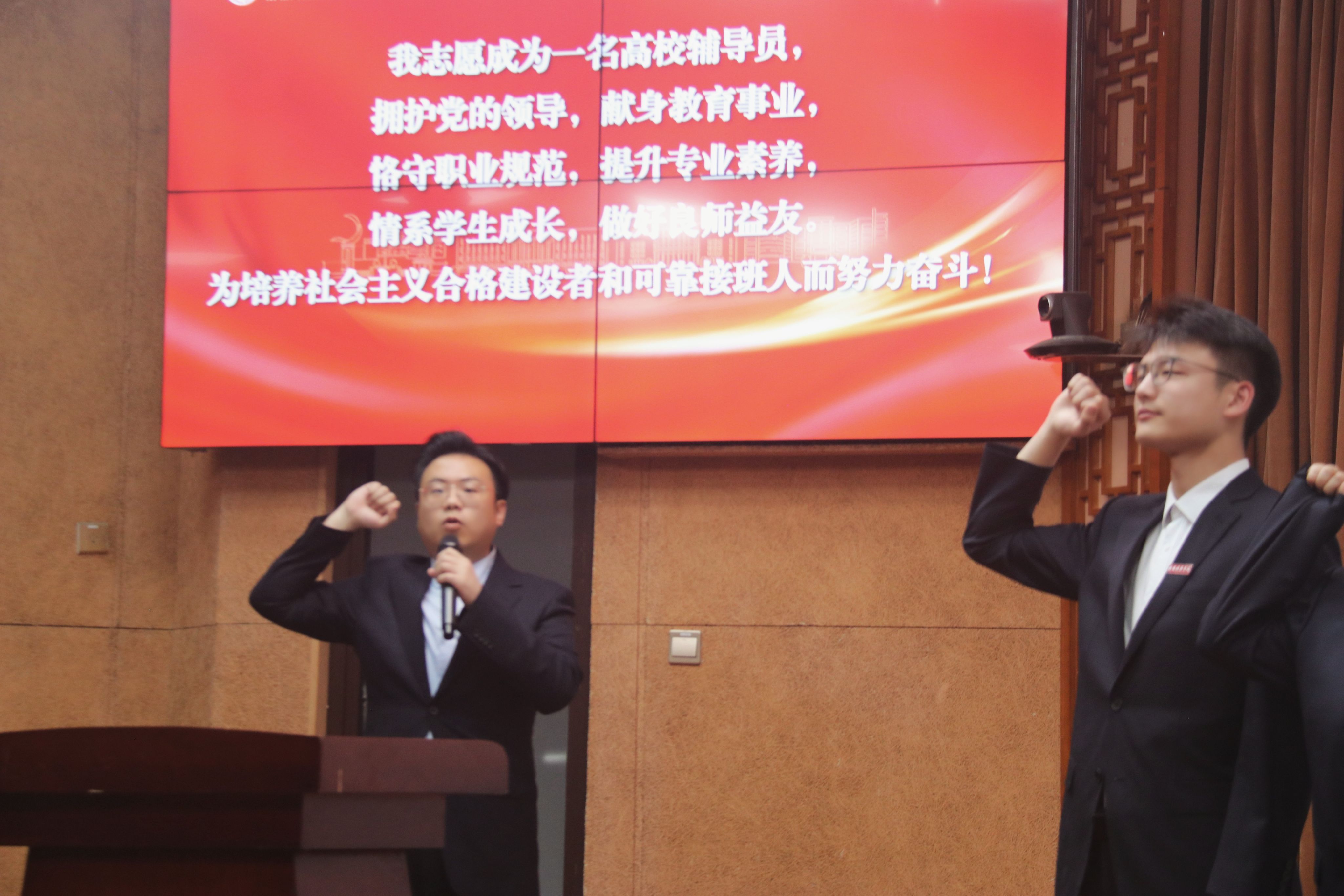 各二级学院书记为新入职辅导员颁发结业证书并赠送工作寄语纪念卡。帮扶导师为新入职辅导员佩戴了校徽并赠送了入职大礼包。同时,新入职的辅导员也为帮扶导师准备了一份心意,向导师赠送并行拜师礼。随后,医学院辅导员陈博威带领全体辅导员进行庄严宣誓。“我志愿成为一名高校辅导员,拥护党的领导……为培养社会主义合格建设者和可靠接班人而努力奋斗!”一字一句,神圣而豪迈,全体学工人也将牢记誓言,铭记嘱托,勤奋务实,开拓创新,为学校教育事业发展和学生成长成才贡献智慧与力量。