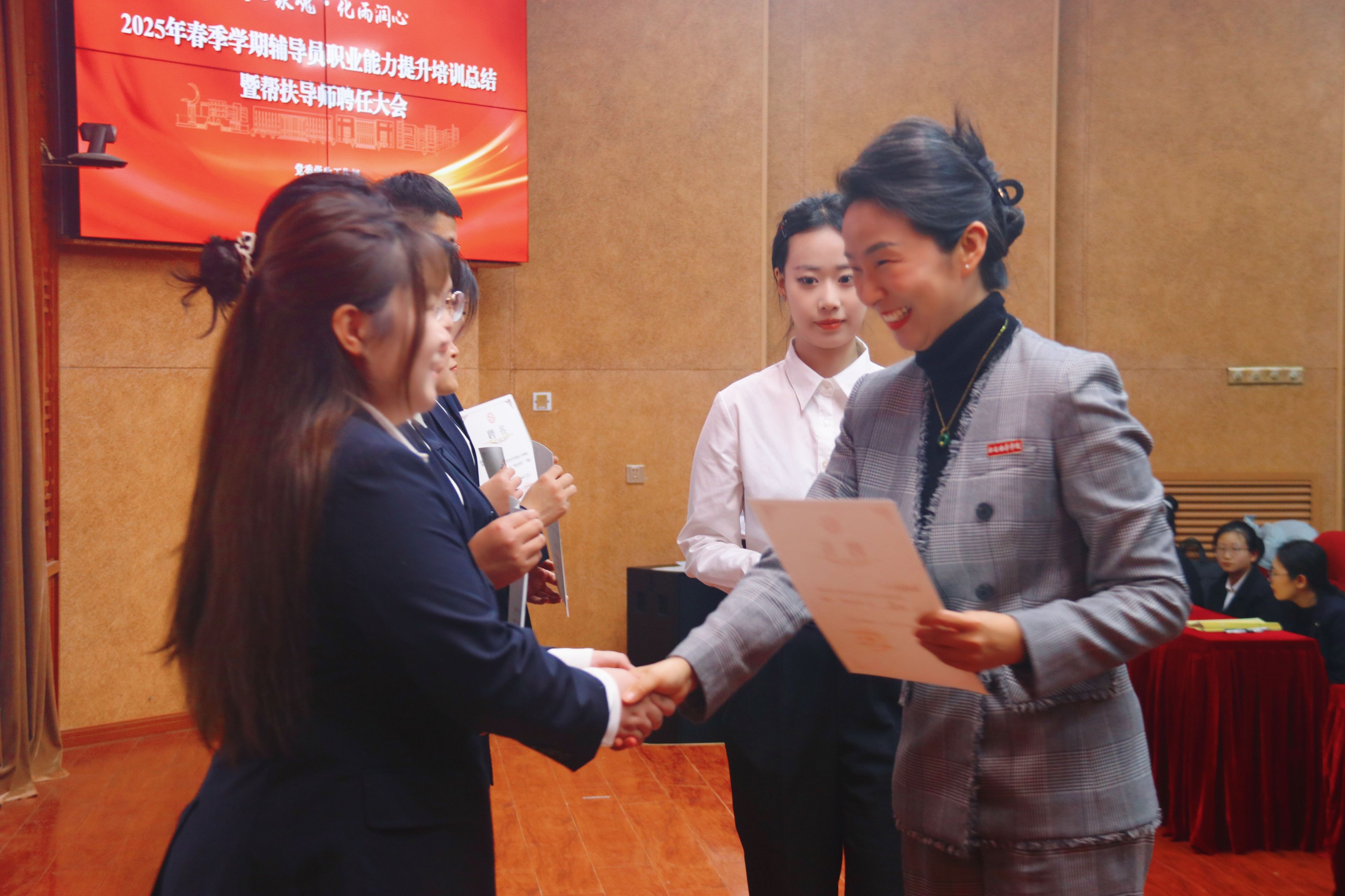 大会中,校团委书记董莹宣读了《关于聘任王娟等同志为新入职辅导员帮扶导师的通知》。党委副书记、副校长姚文静教授为帮扶导师颁发了聘书。