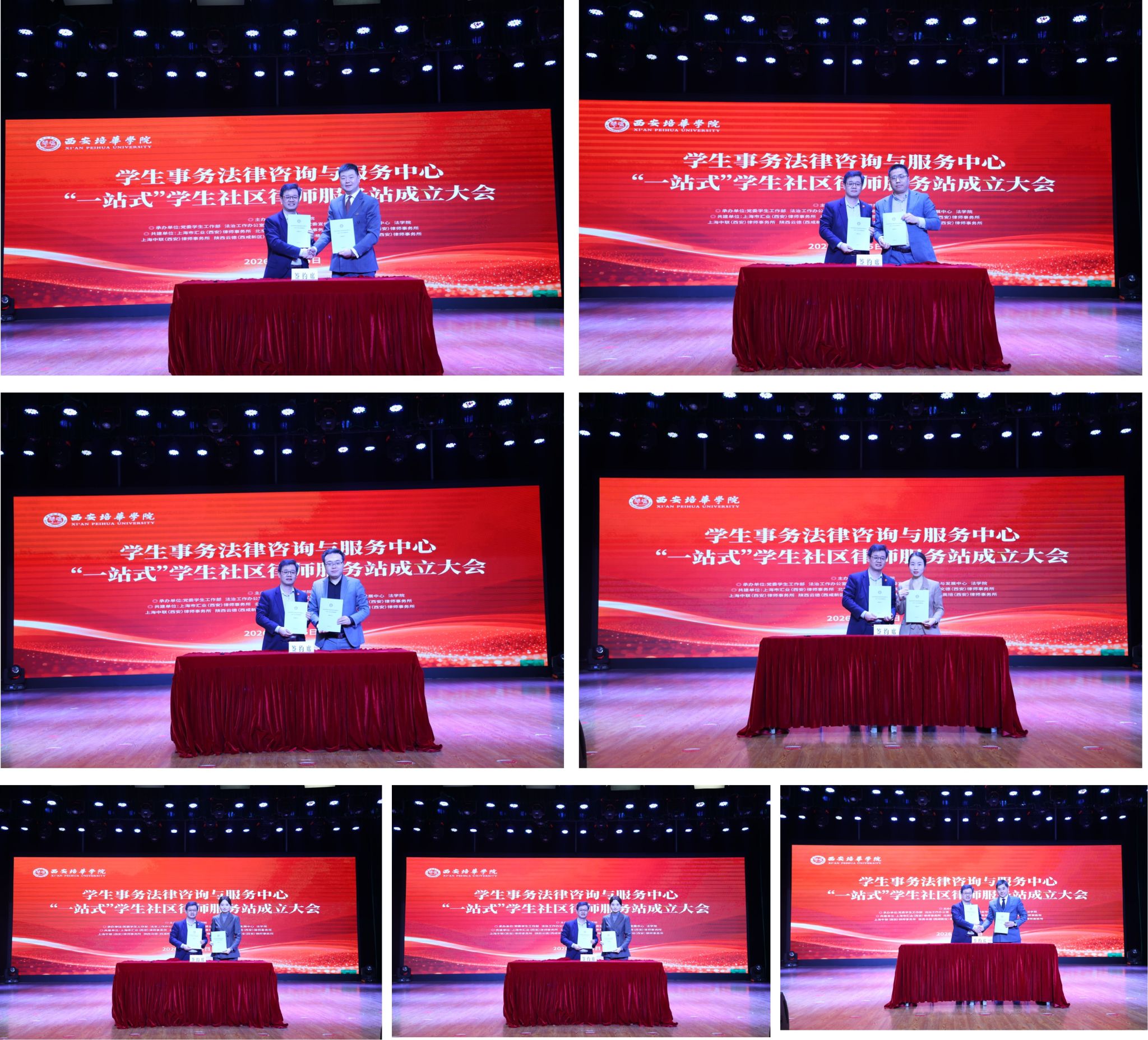 党委学工部副部长、校友服务与发展中心主任王飞代表学校与上海市汇业(西安)律师事务所、北京市盈科(西安)律师事务所、北京市中伦文德(西安)律师事务所、上海中联(西安)律师事务所、陕西云德(西咸新区)律师事务所、陕西华格律师事务所、陕西英培(西安)律师事务所等七家合作律师事务所签署共建协议,建立长期稳定的校所协作机制。此次签约,将实现校所优势互补、资源共享,共同推动法律服务与校园育人深度融合,为学生提供专业法治保障。