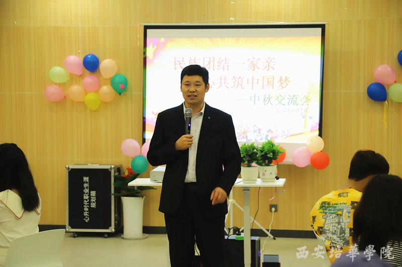 党委学工部部长、校团委书记蔡亮在讲话中表示此次活动是学校对各民族学生的关心、关爱,送来的“秋天里的第一抹甜”。同学们对学校的信任是无价的,期待是不可辜负的,只要大家认真努力,奋斗拼搏,在未来的大学生活里都会给自己交上满意的答卷。同时,他强调同学们要热爱祖国、热爱家乡,进一步提升民族自信,加强民族团结,做不辜负时代、不辜负父母、不辜负家乡的时代骄子。最后在国庆和中秋来临之际,谨代表学校祝福每一位大一新生中秋快乐,国庆快乐。